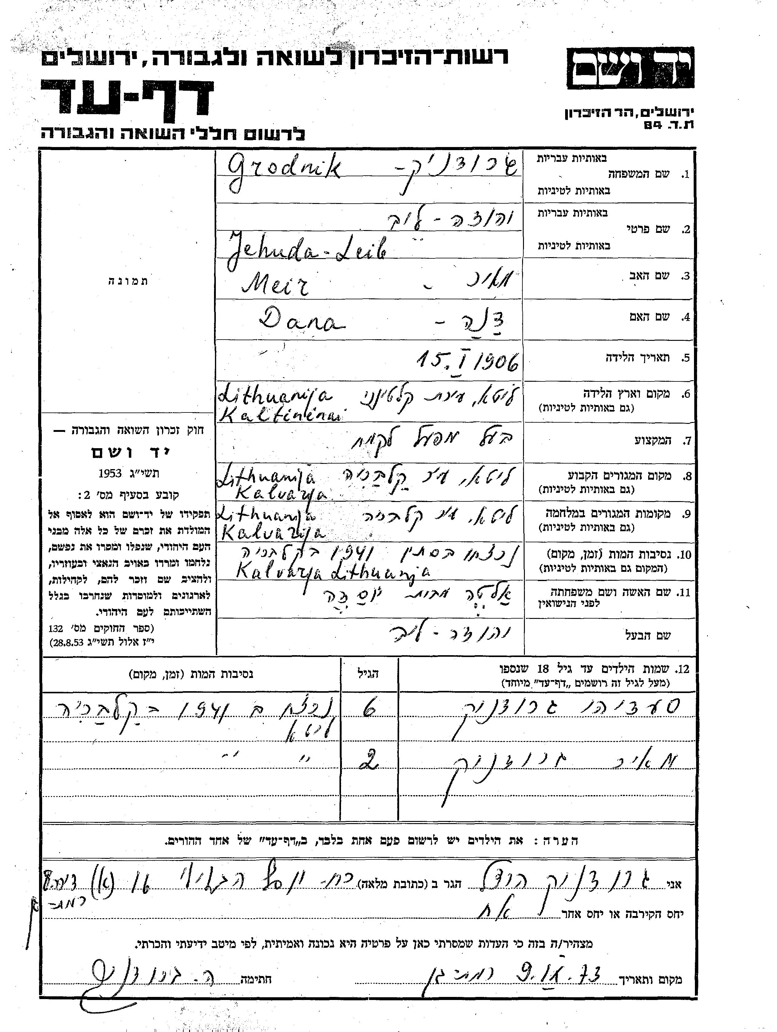 Grodnik Meir Kalvaria, Litauen Gedenkblatt