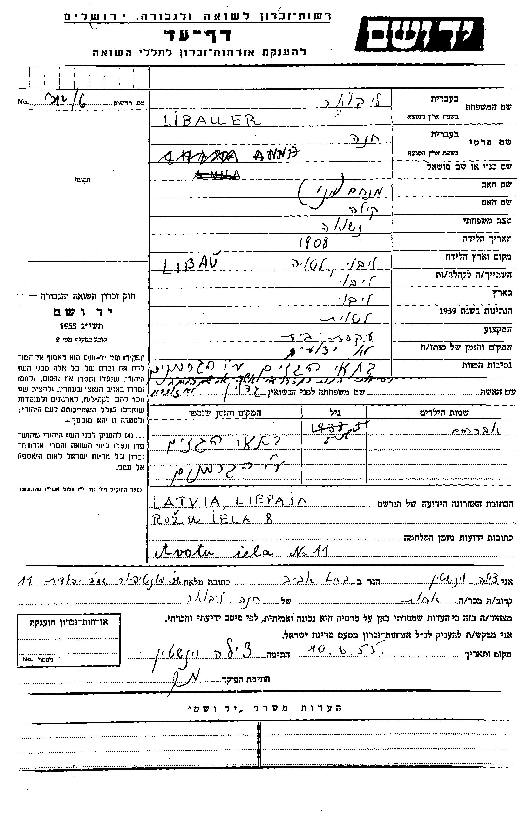 Avraham Libauer wurde im Jahr 1938 geboren. Er war der Sohn von Anna Khana, geb. Gdalin. Er war Kind. Vor dem Zweiten Weltkrieg lebte er in Libau, Lettland. Während des Krieges war er in Libau, Lettland.