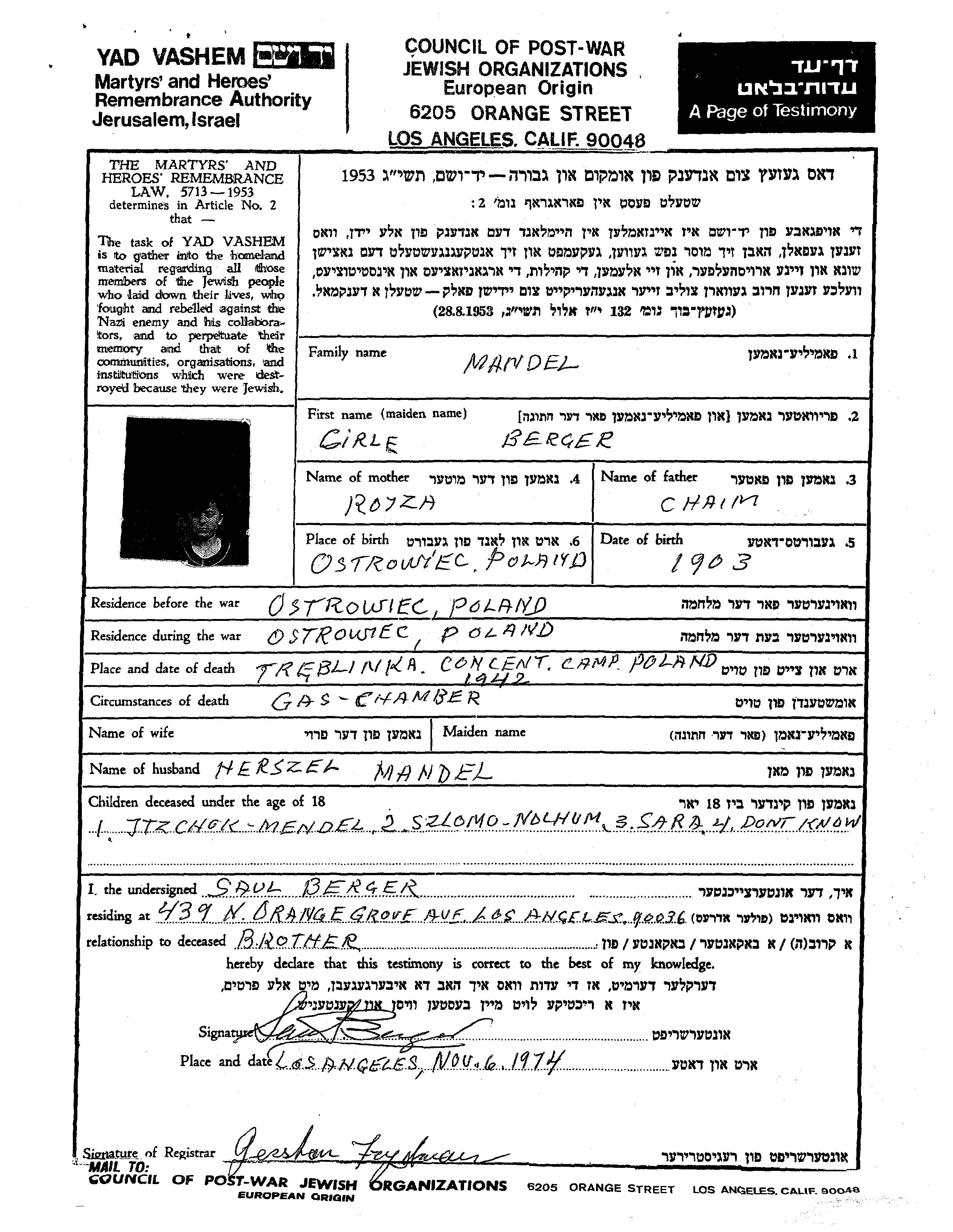 Szlomo Nochum Mandel wurde Er war der Sohn von Herszel und Cirle, geb. Berger. Er war Kind. Vor dem Zweiten Weltkrieg lebte er in Ostrowiec, Polen. Während des Krieges war er in Ostrowiec, Polen.