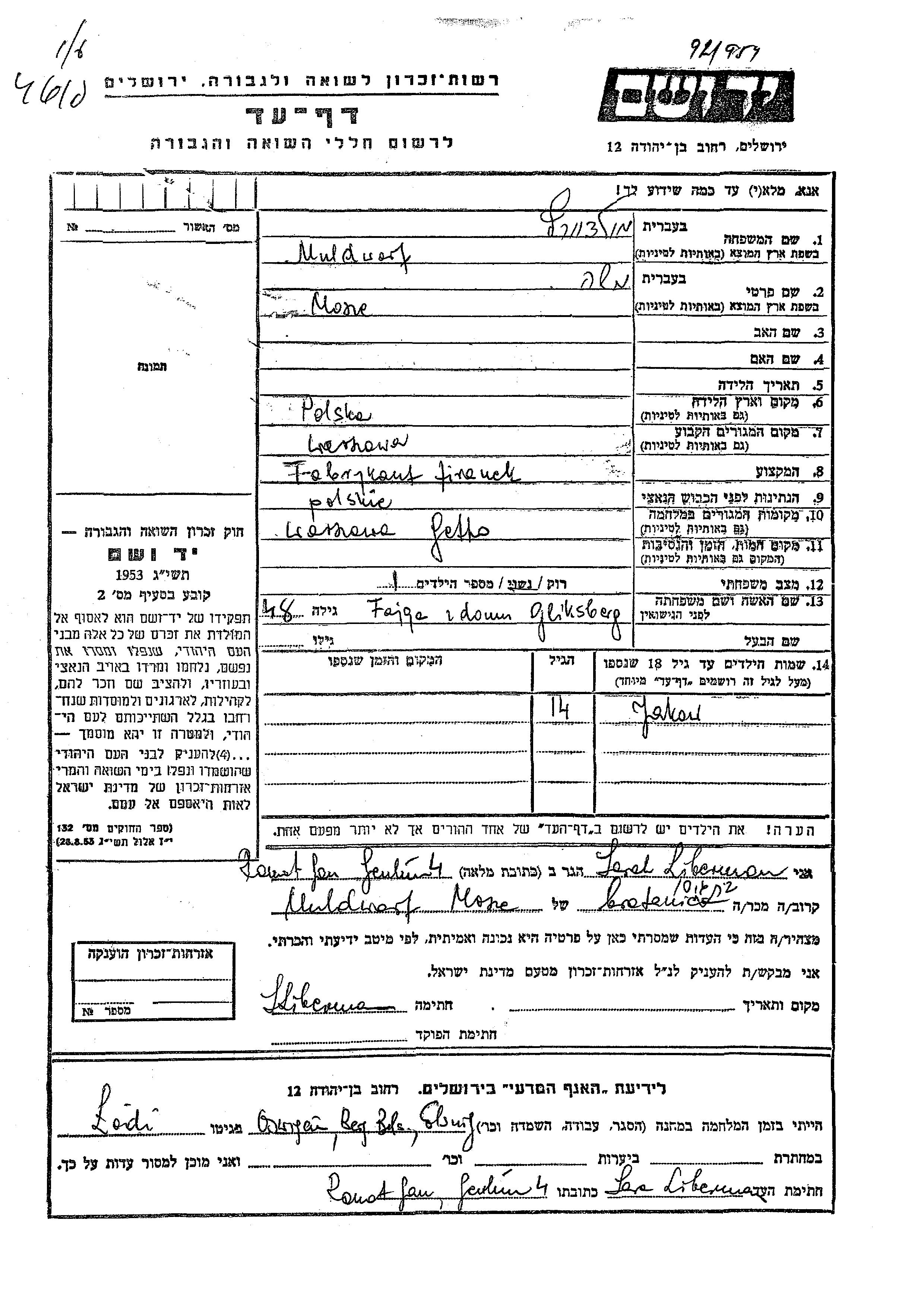 Jakov Muldvorf wurde Er war der Sohn von Mosze und Faiga, geb. Gliksberg. Er war Kind. Vor dem Zweiten Weltkrieg lebte er in Warszawa, Polen. Während des Krieges war er in Warszawa, Polen.