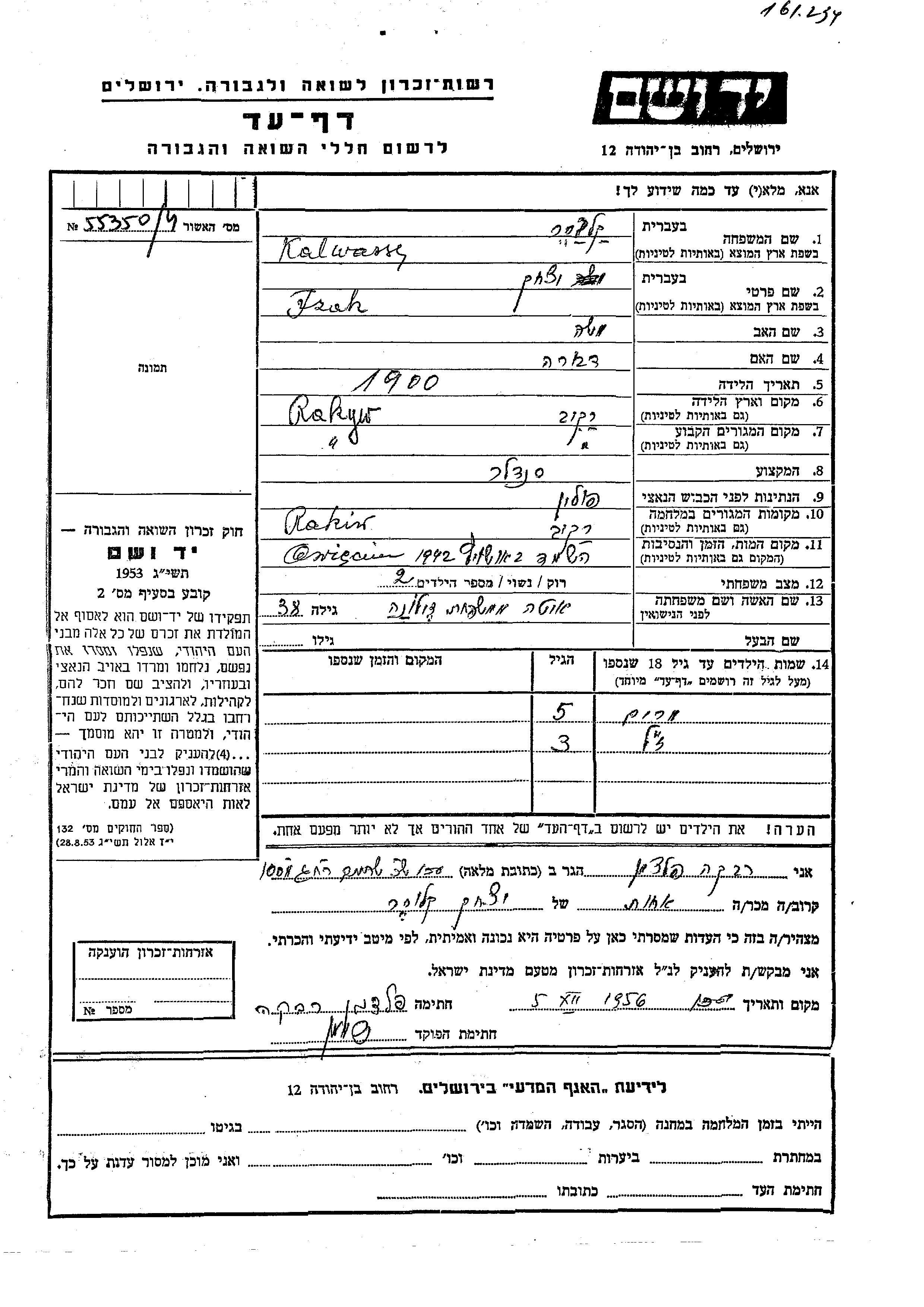 Vorname unbekannt Kalwasser wurde Er/sie war der/ die Sohn/Tochter von Izak und Ita, geb. Zeloni. Er/Sie war Kind. Vor dem Zweiten Weltkrieg er/sie in Rakow, Polen. Während des Krieges war er/sie in Rakiw, Polen.