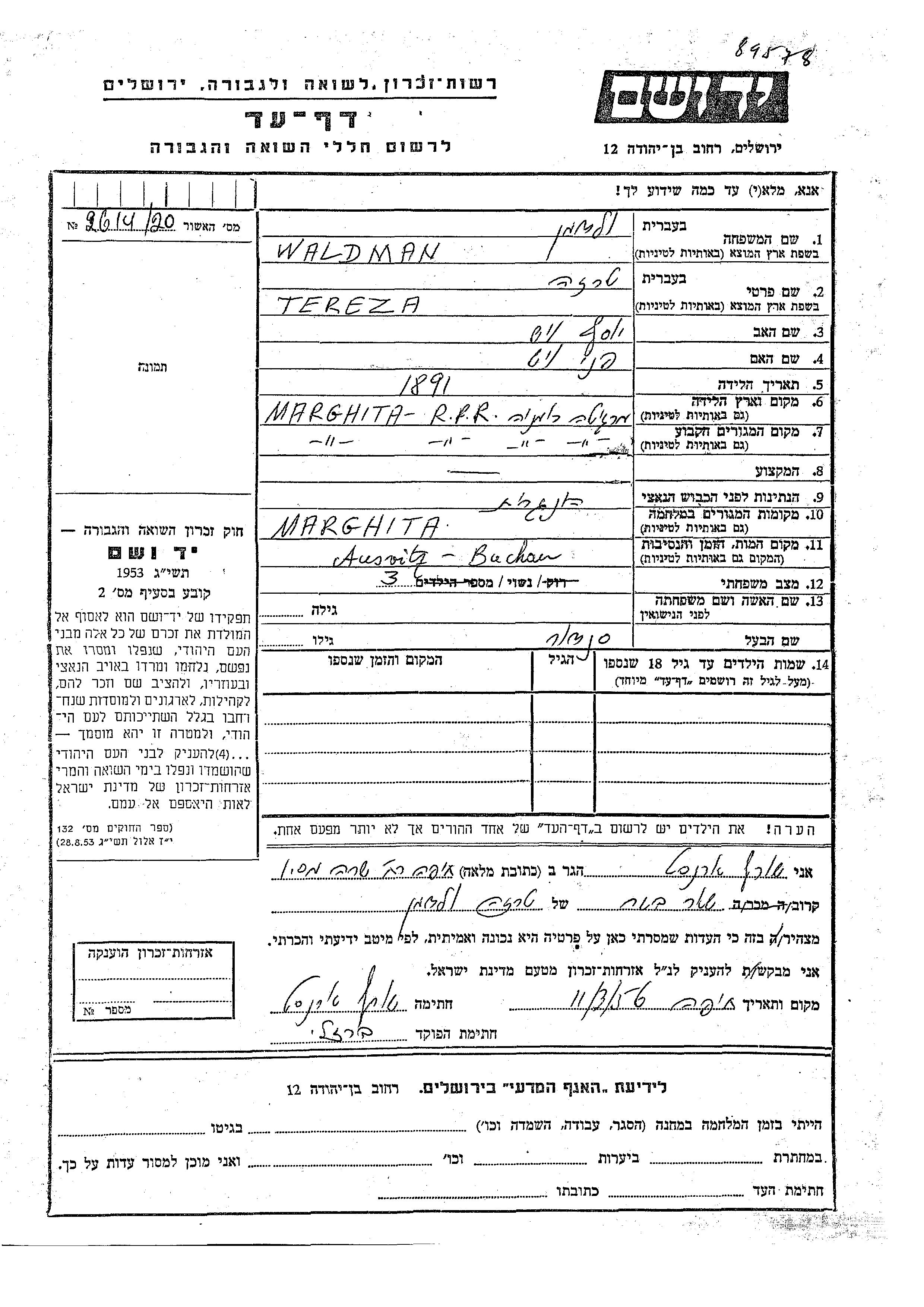 Tereza Waldman wurde im Jahr 1891 in Marghita, Rumänien geboren. Sie war die Tochter von Yosef und Fani. Sie war mit Sandor Verheiratet. Vor dem Zweiten Weltkrieg lebte sie in Marghita, Rumänien. Während des Krieges war sie in Margita, Rumänien.