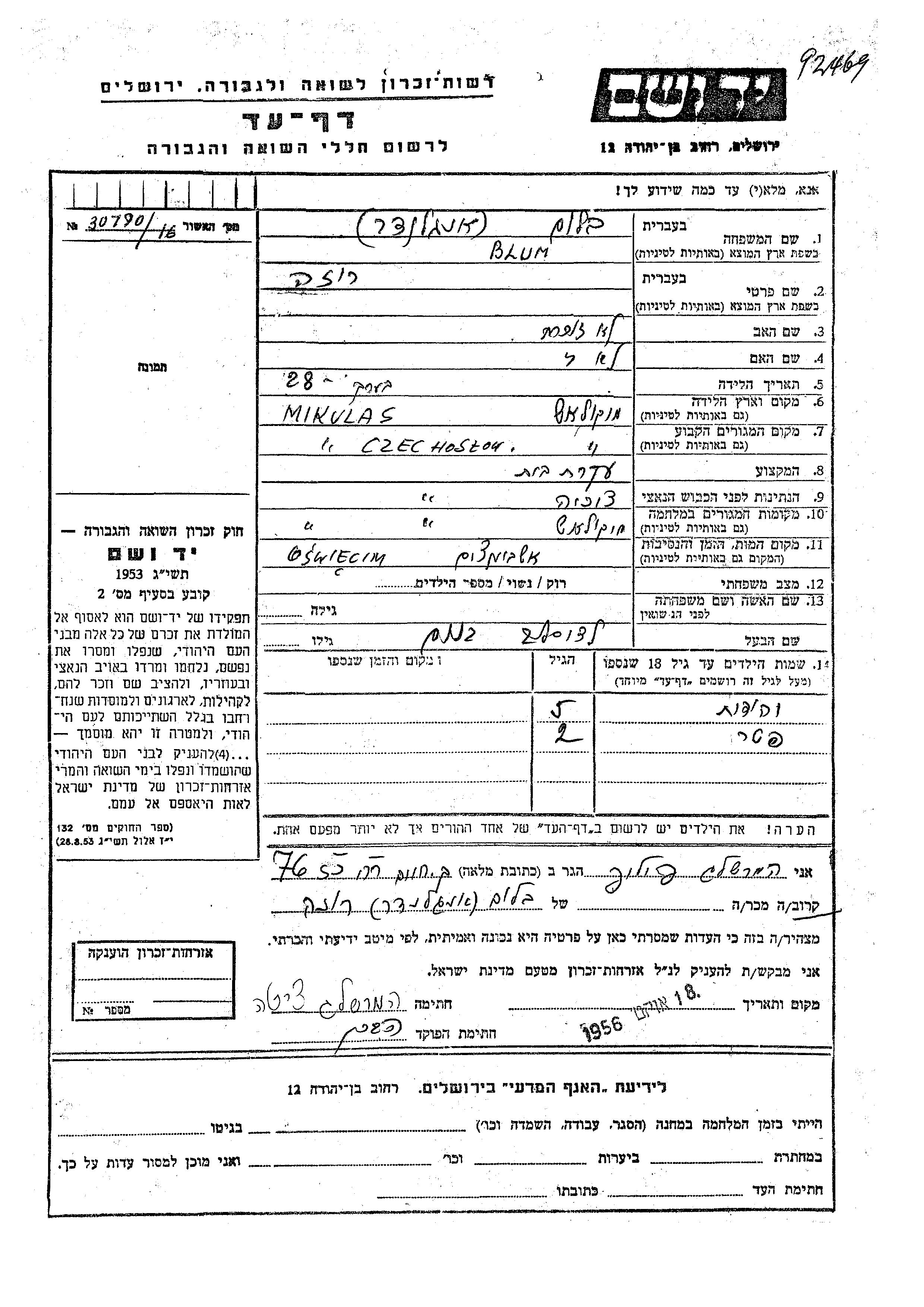 Peter Blum wurde Er war der Sohn von Ladislav und Roza, geb. Englender. Er war Kind. Vor dem Zweiten Weltkrieg lebte er in Mikulas, Tschechoslowakei. Während des Krieges war er in Mikulas, Tschechoslowakei.