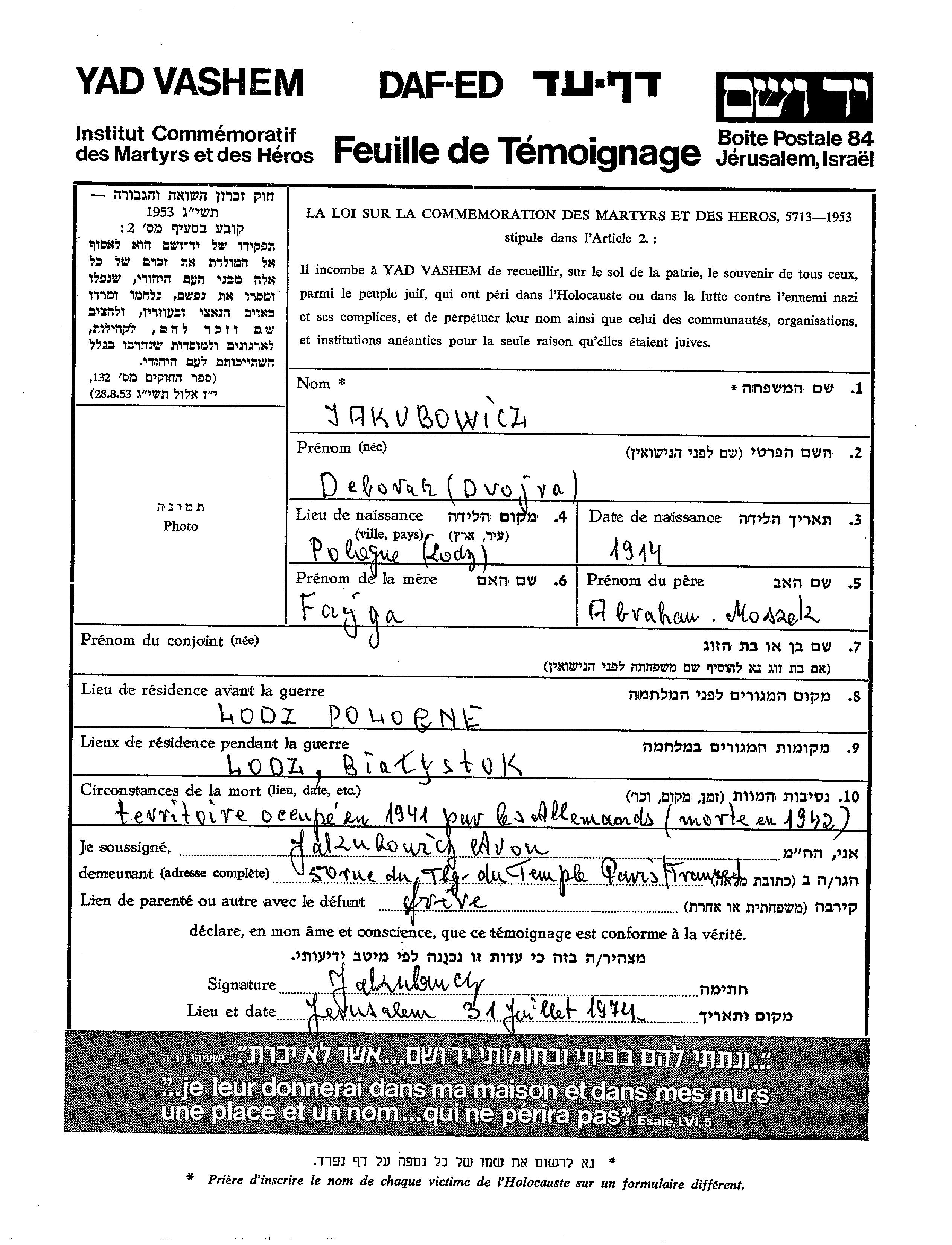 Jakubowicz Deborah 1914 Lodz, Polen Gedenkblatt