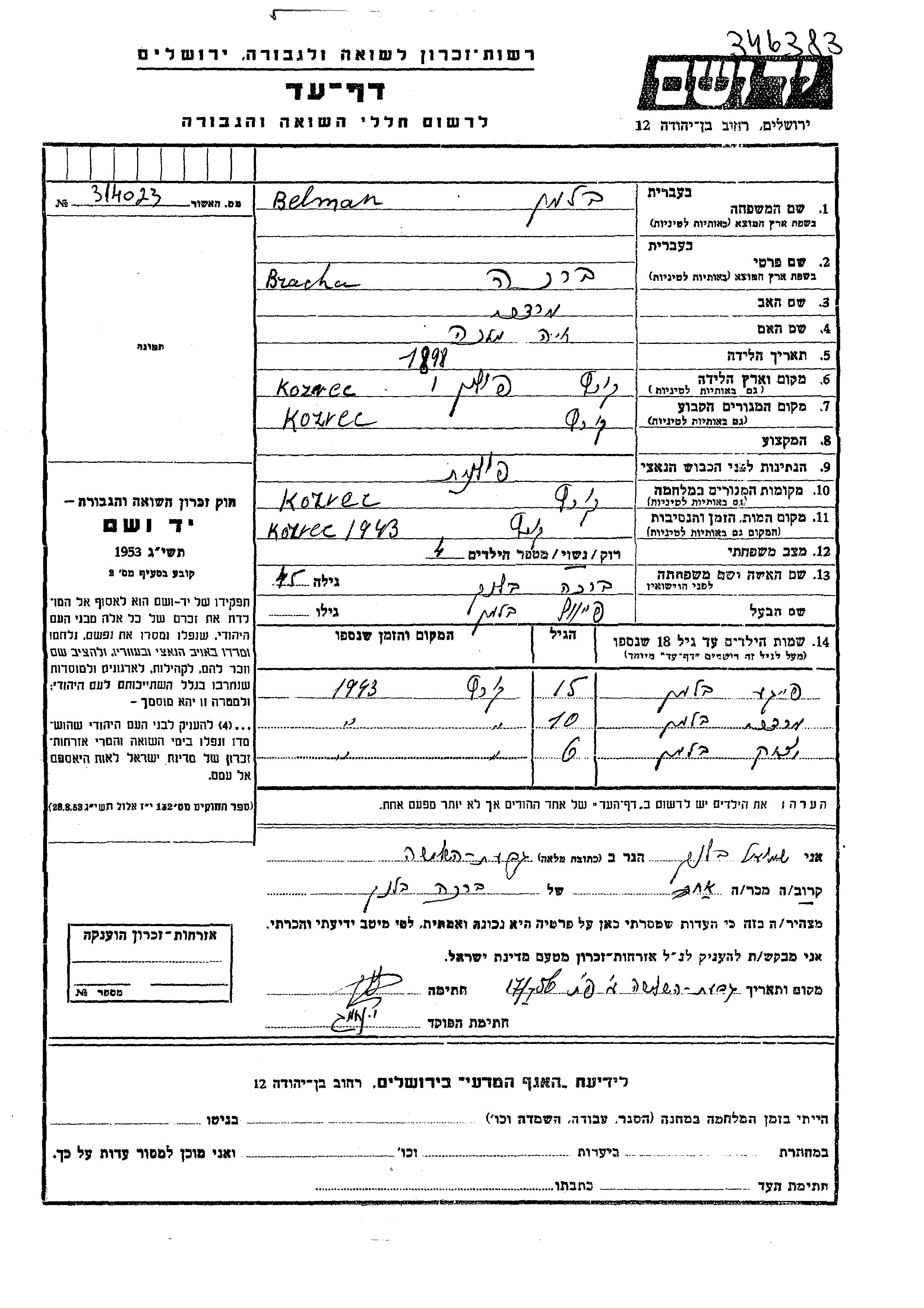 Feige Belman wurde Sie war die Tochter von Faivel und Bracha, geb. Blank. Sie war Kind. Vor dem Zweiten Weltkrieg lebte sie in Korzec, Polen. Während des Krieges war sie in Korzec, Polen.