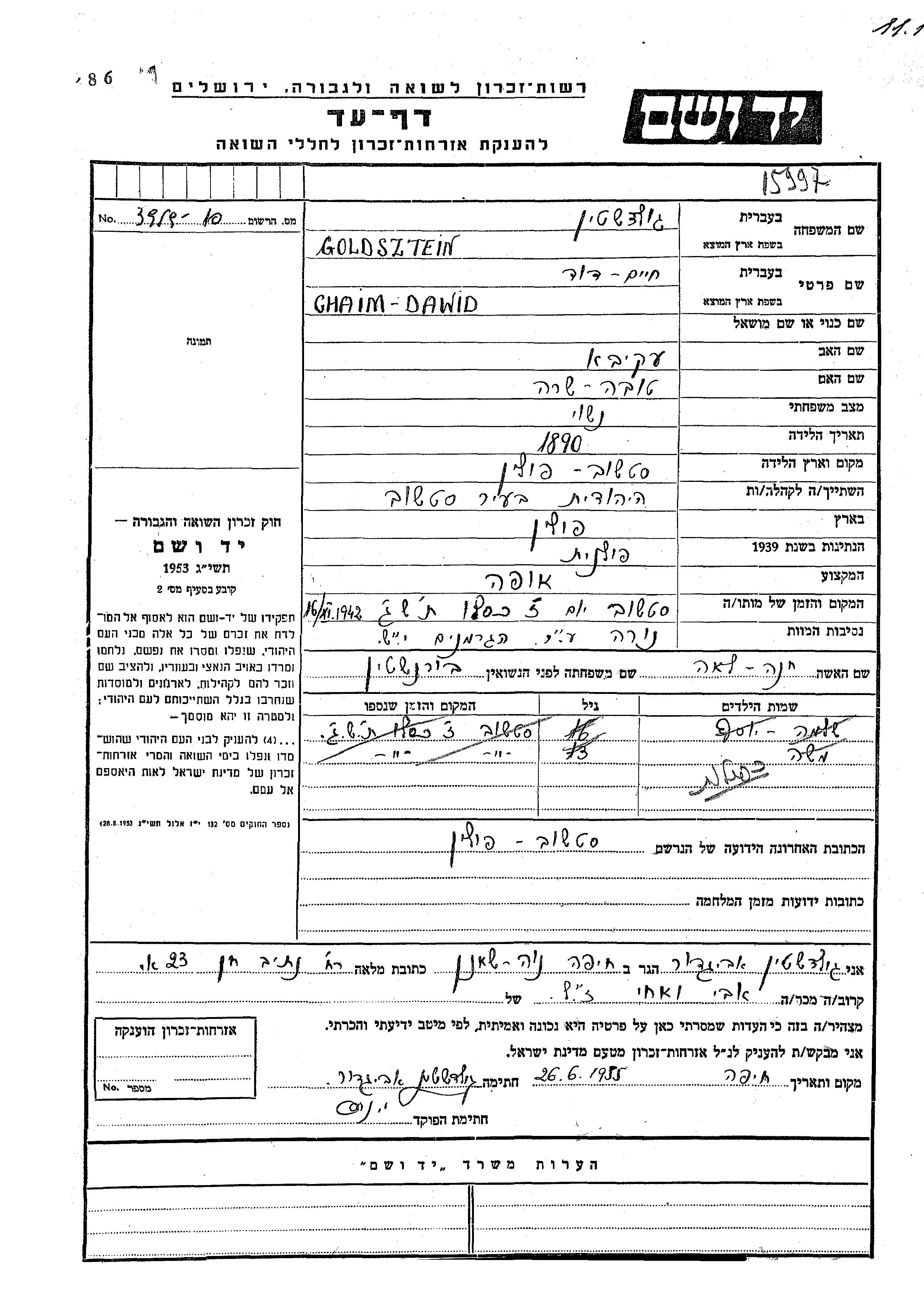 Moshe Goldsztein wurde Er war der Sohn von Chaim Dawid und Khana Lea, geb. Bornshtein. Er war Kind.