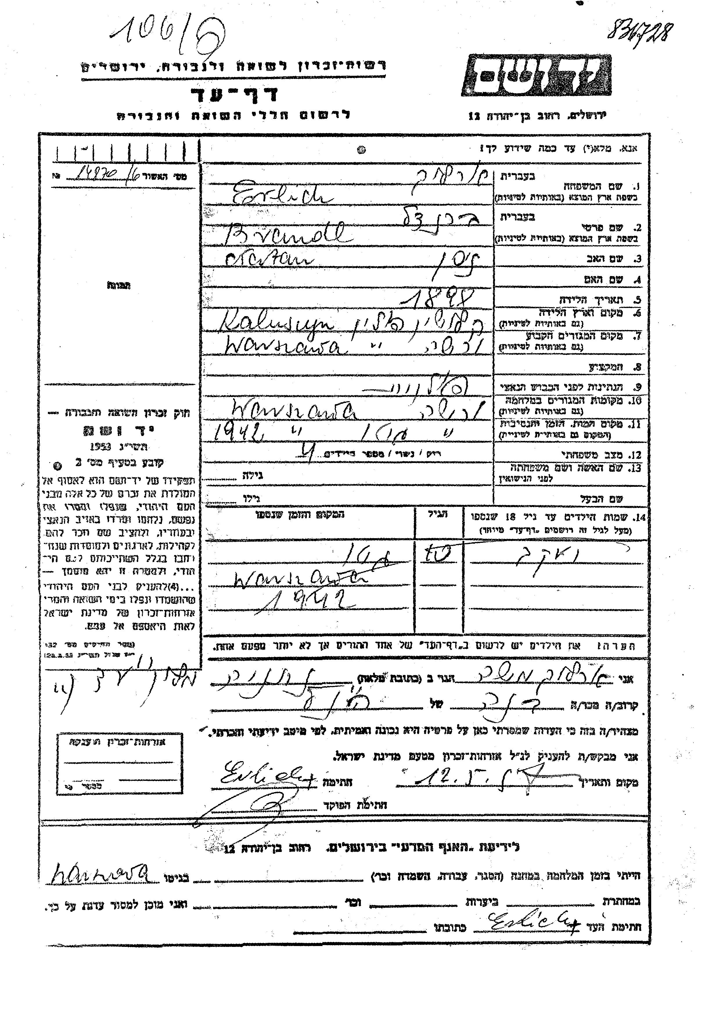 Erlich Yaakov Warszawa, Polen Gedenkblatt