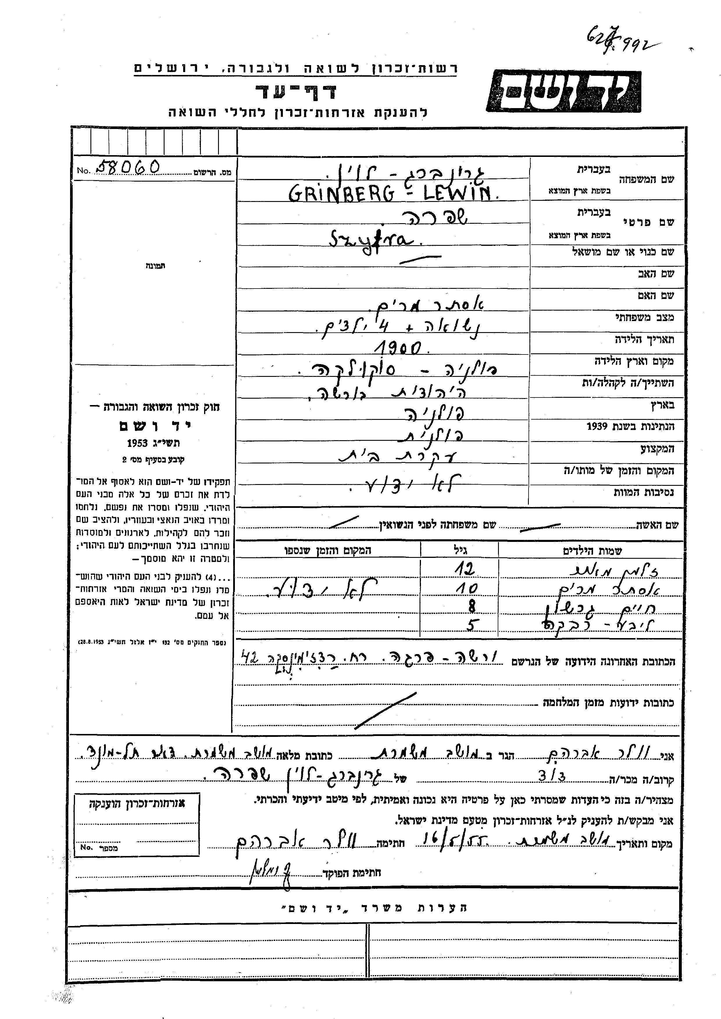Zalman Meir Lewin Grinberg wurde Er war der Sohn von Szyfra. Er war Kind. Vor dem Zweiten Weltkrieg lebte er in Warszawa, Polen.