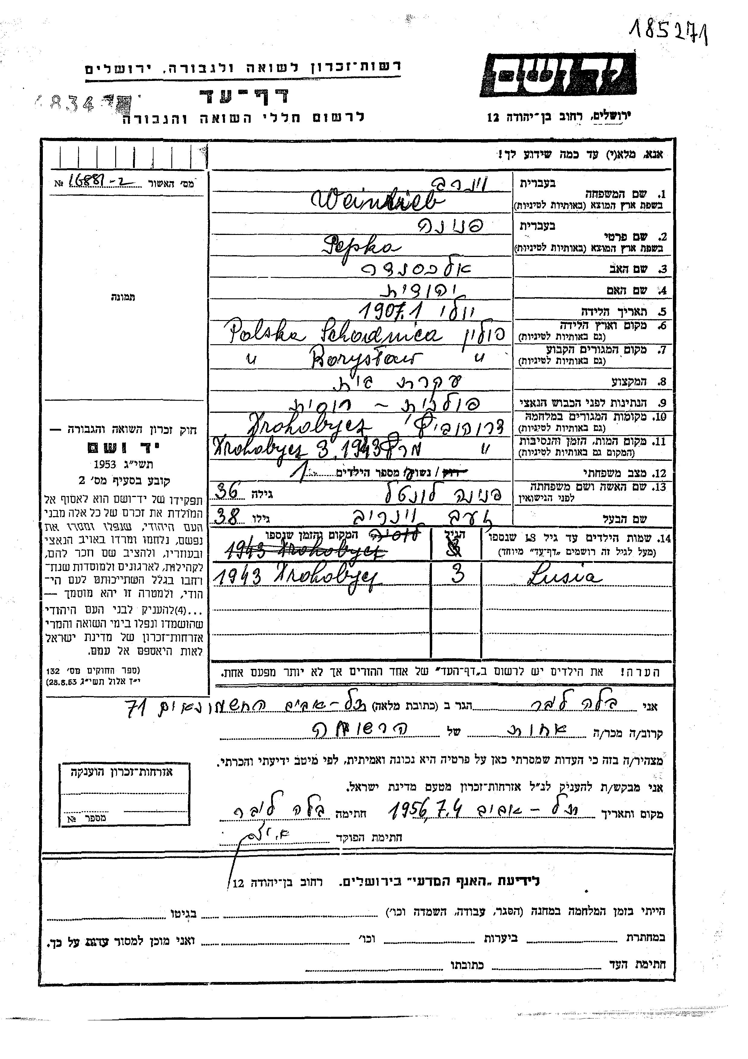 Lusia Weinrieb wurde Sie war die Tochter von Zeev und Pepka Pnina, geb. Levental. Sie war Kind. Vor dem Zweiten Weltkrieg lebte sie in Boryslaw, Polen. Während des Krieges war sie in Drohobitch, Polen.