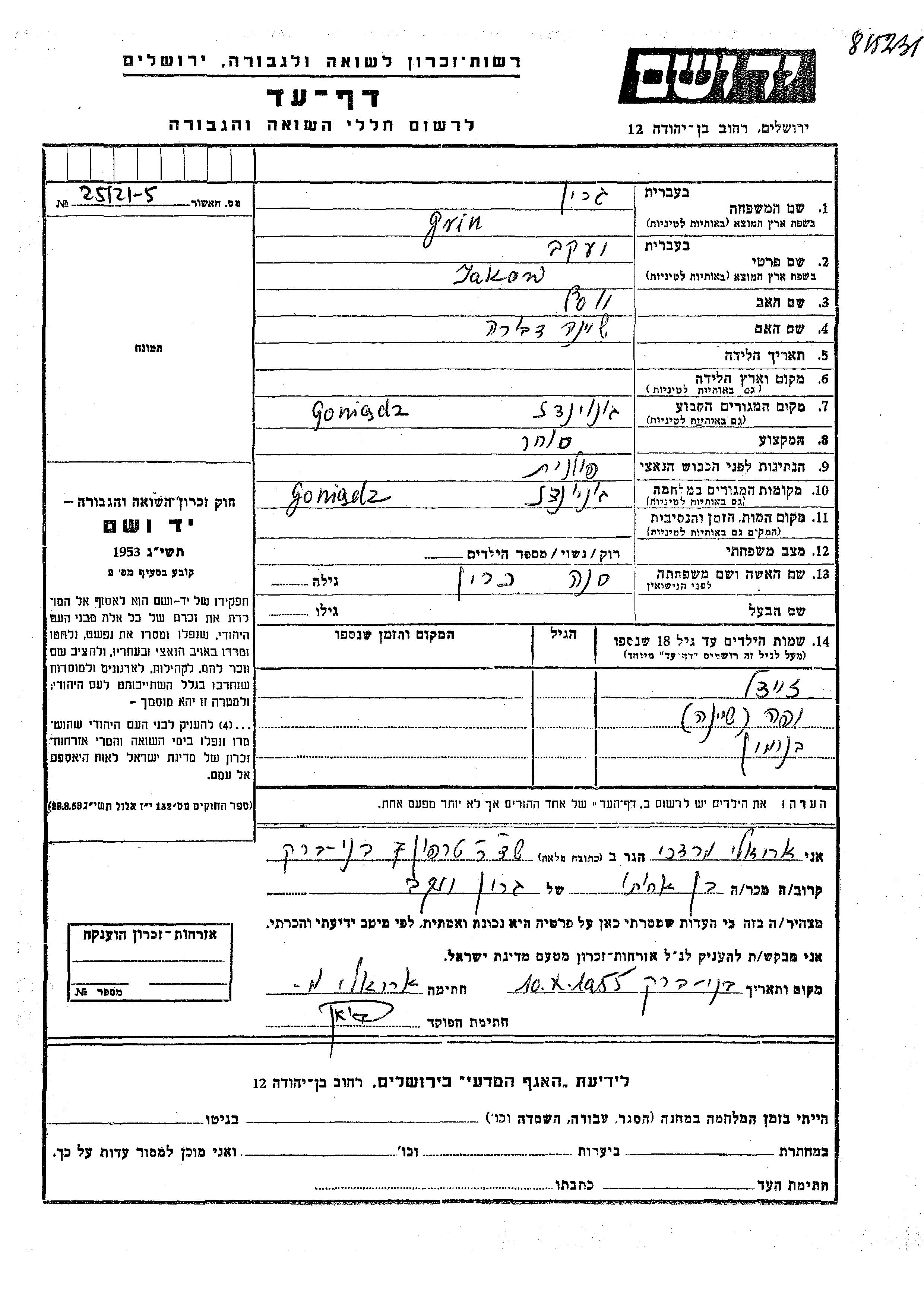 Yafa Sheina Grin wurde Sie war die Tochter von Jakow und Khana, geb. Brun. Sie war Kind. Vor dem Zweiten Weltkrieg lebte sie in Goniadz, Polen. Während des Krieges war sie in Goniadz, Polen.