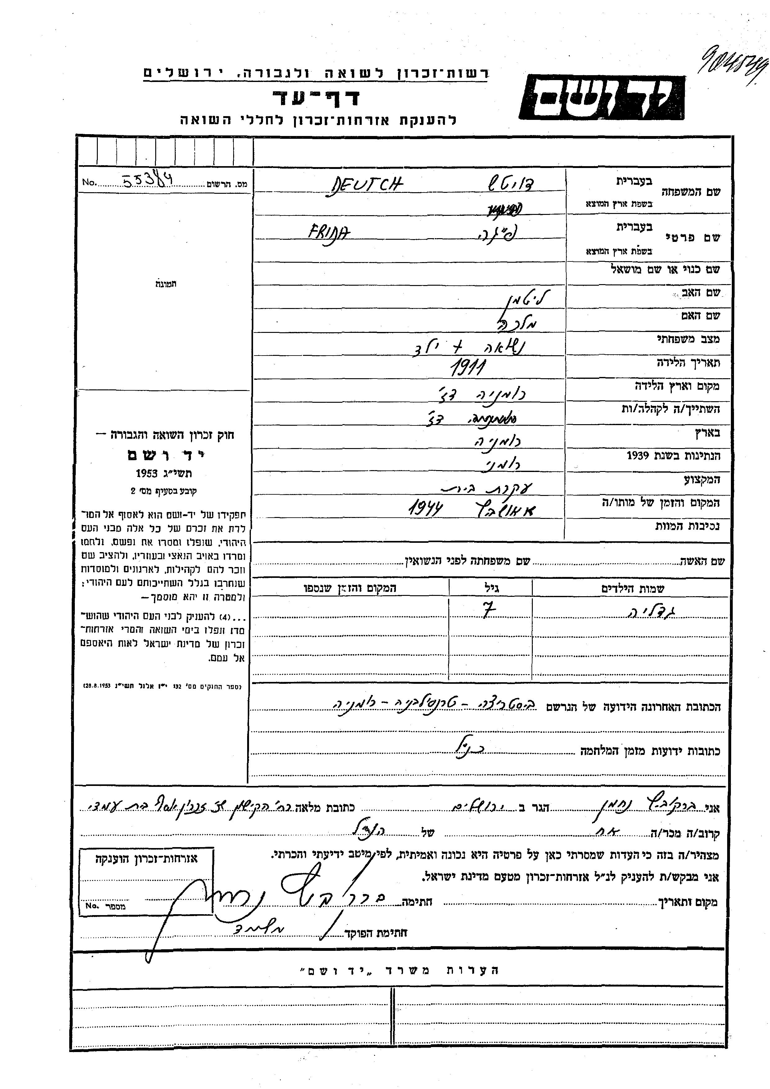 Gedalia Deutsch wurde Er war der Sohn von Frida Feiga. Er war Kind. Vor dem Zweiten Weltkrieg lebte er in Dej, Rumänien. Während des Krieges war er in Dej, Rumänien.