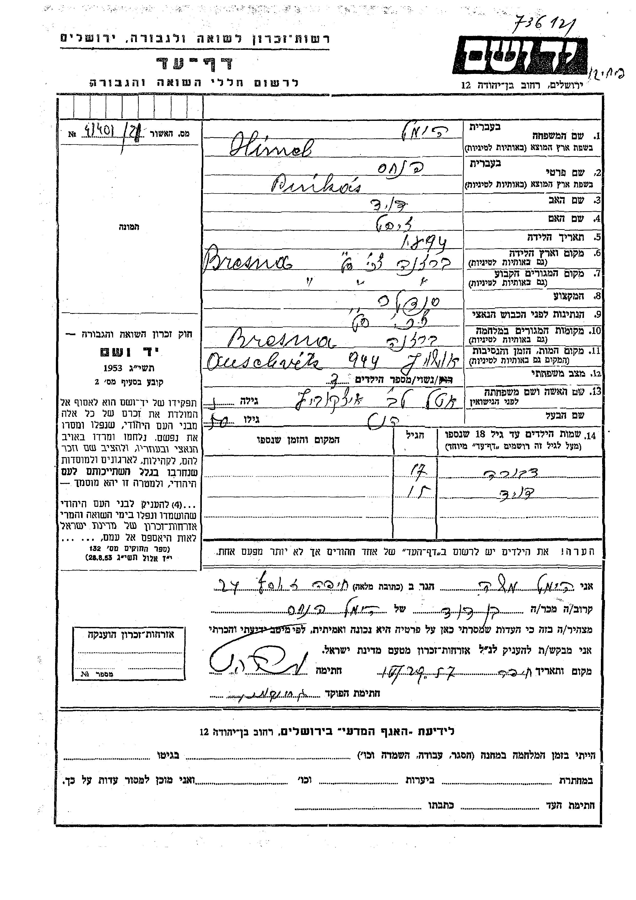 Himel Dvora Brezno, Gedenkblatt