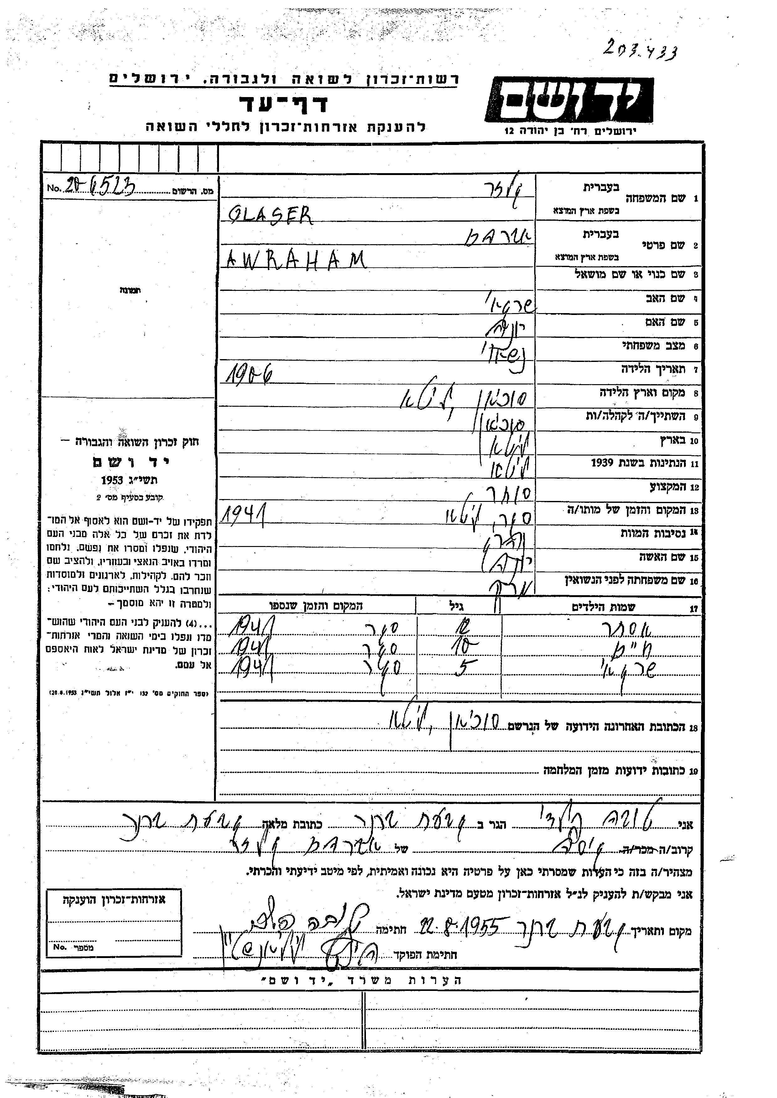 Shraga Glaser wurde Er war der Sohn von Awraham und Yona, geb. Mark. Er war Kind. Vor dem Zweiten Weltkrieg lebte er in Swieciany, Polen. Während des Krieges war er in Swieciany, Polen.
