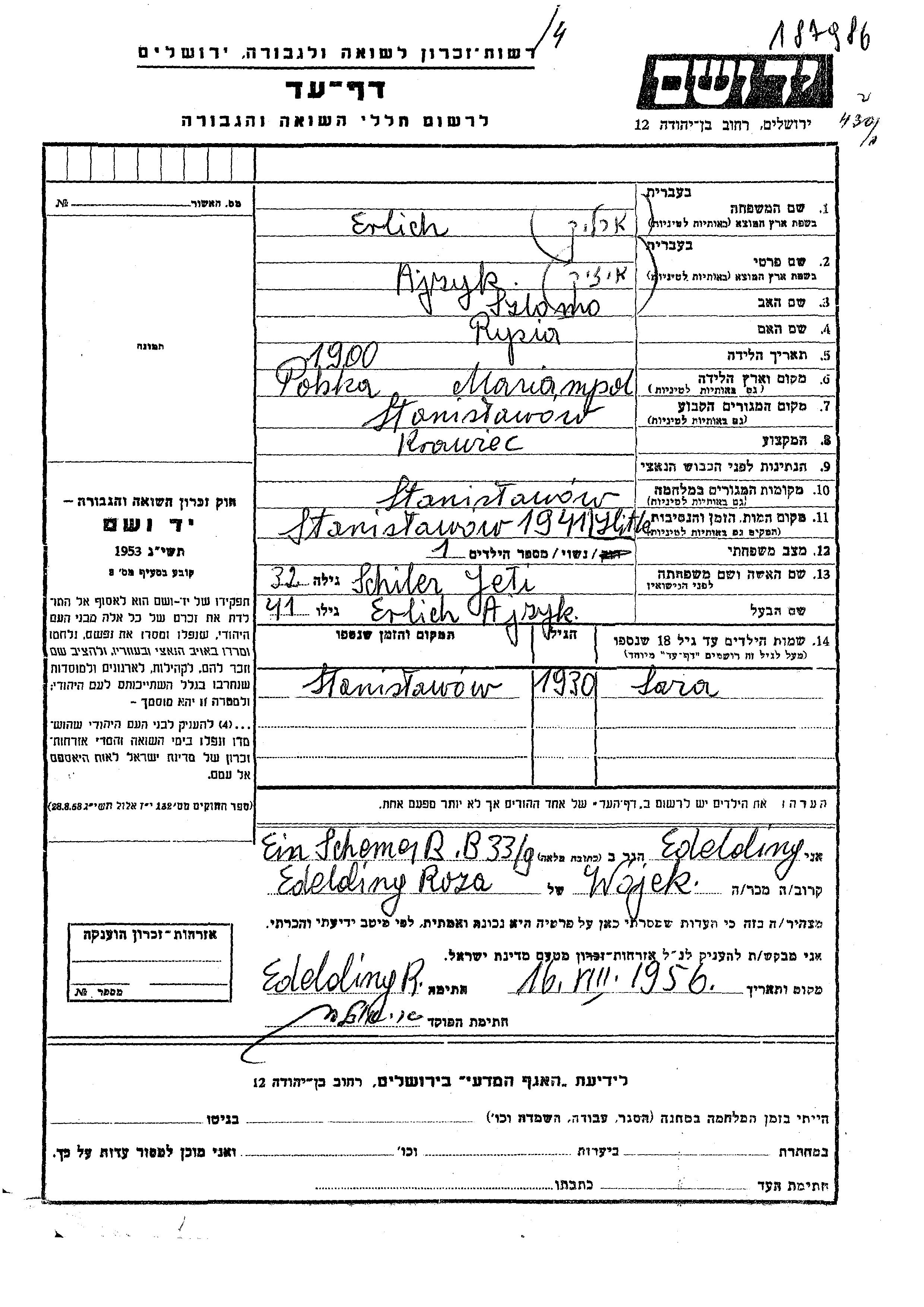 Erlich Sara 1930 Stanislawow, Polen Gedenkblatt