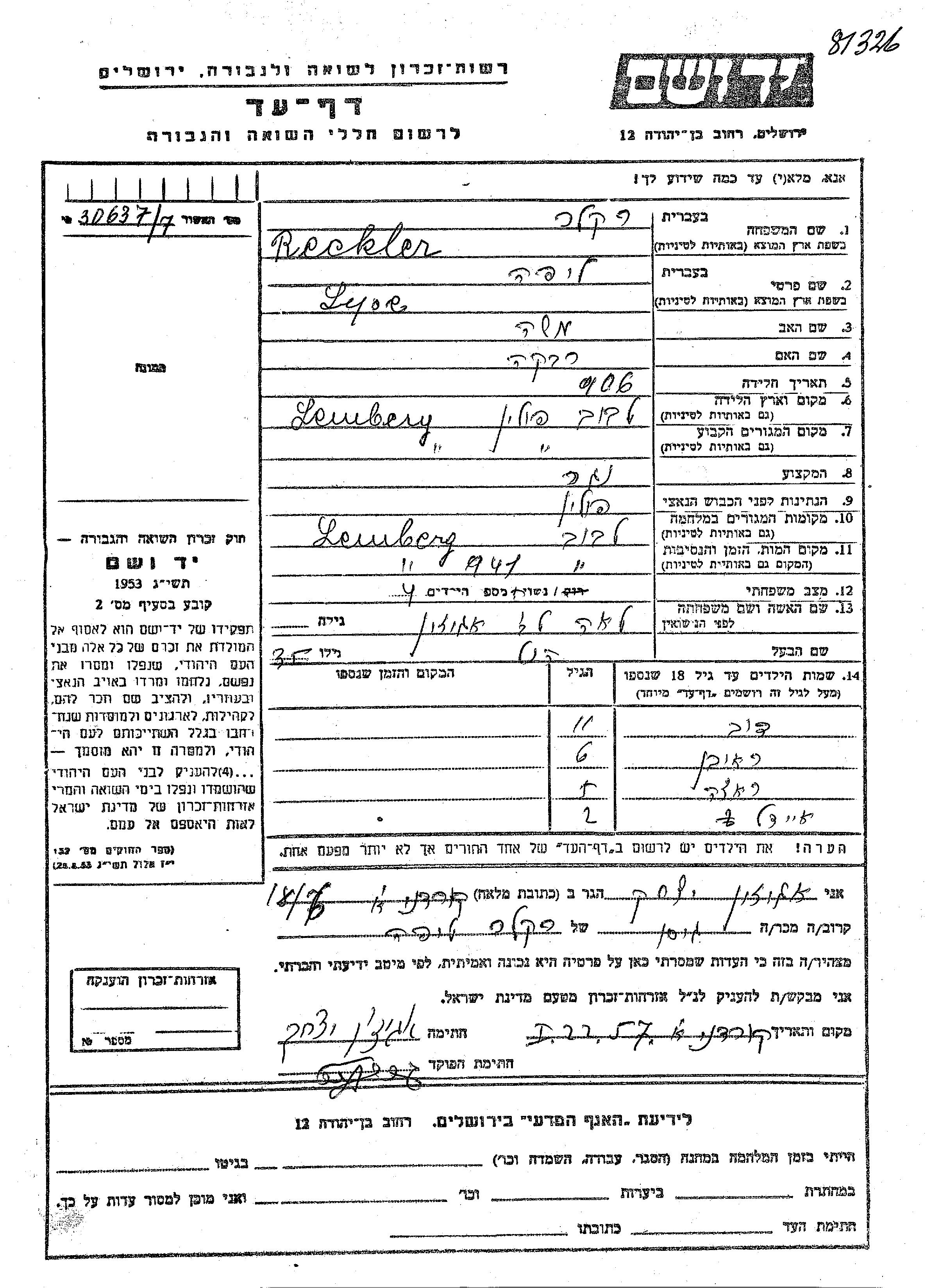Eidel Reckler wurde Er/sie war der/ die Sohn/Tochter von Lipa und Lea, geb. Agizon. Er/Sie war Kind. Vor dem Zweiten Weltkrieg er/sie in Lwow, Polen. Während des Krieges war er/sie in Lwow, Polen.