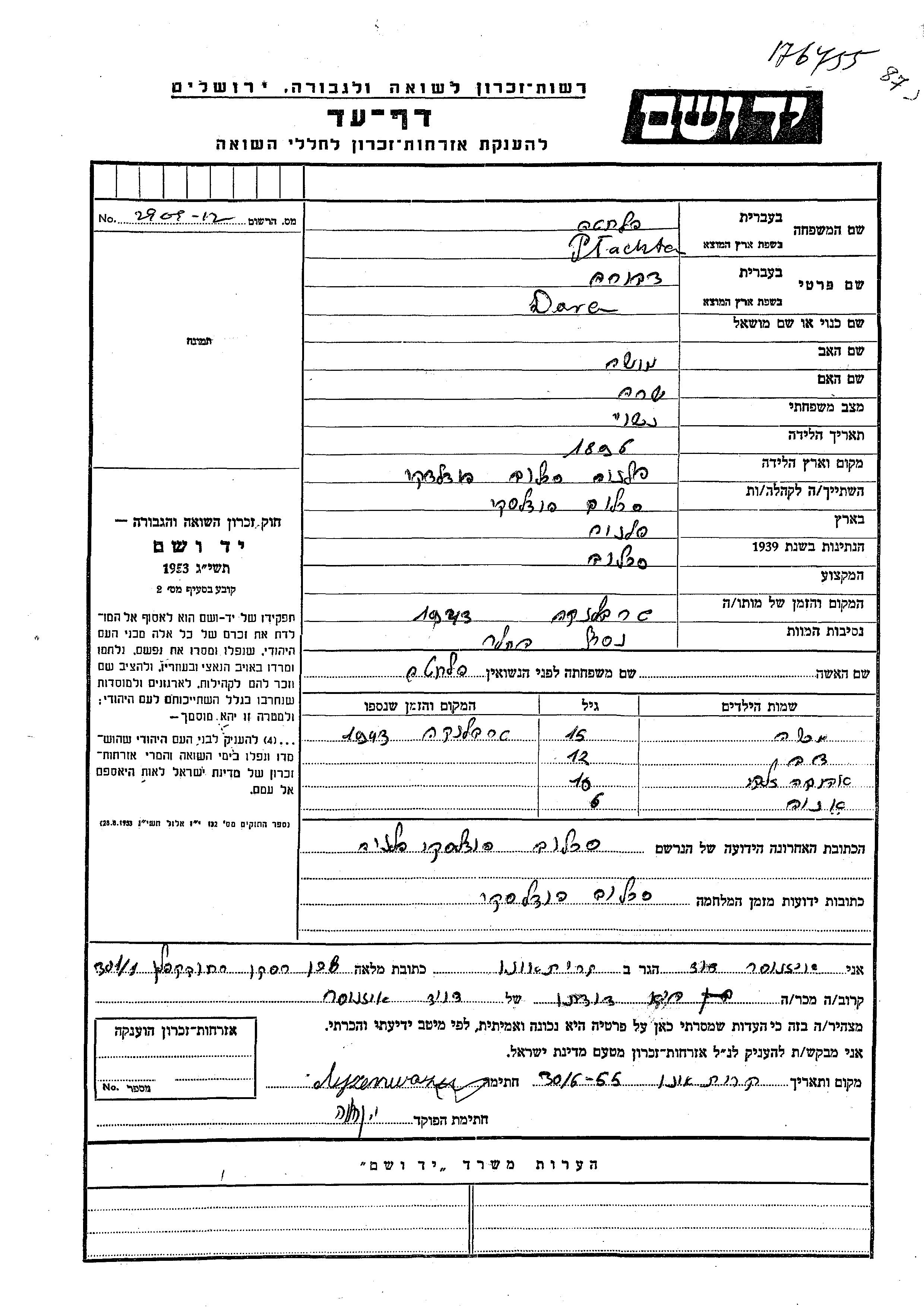 Moshe Plachta wurde Er war der Sohn von Dora Dvora. Er war Kind. Vor dem Zweiten Weltkrieg lebte er in Sokolow Podlaski, Polen. Während des Krieges war er in Sokolow Podlaski, Polen.