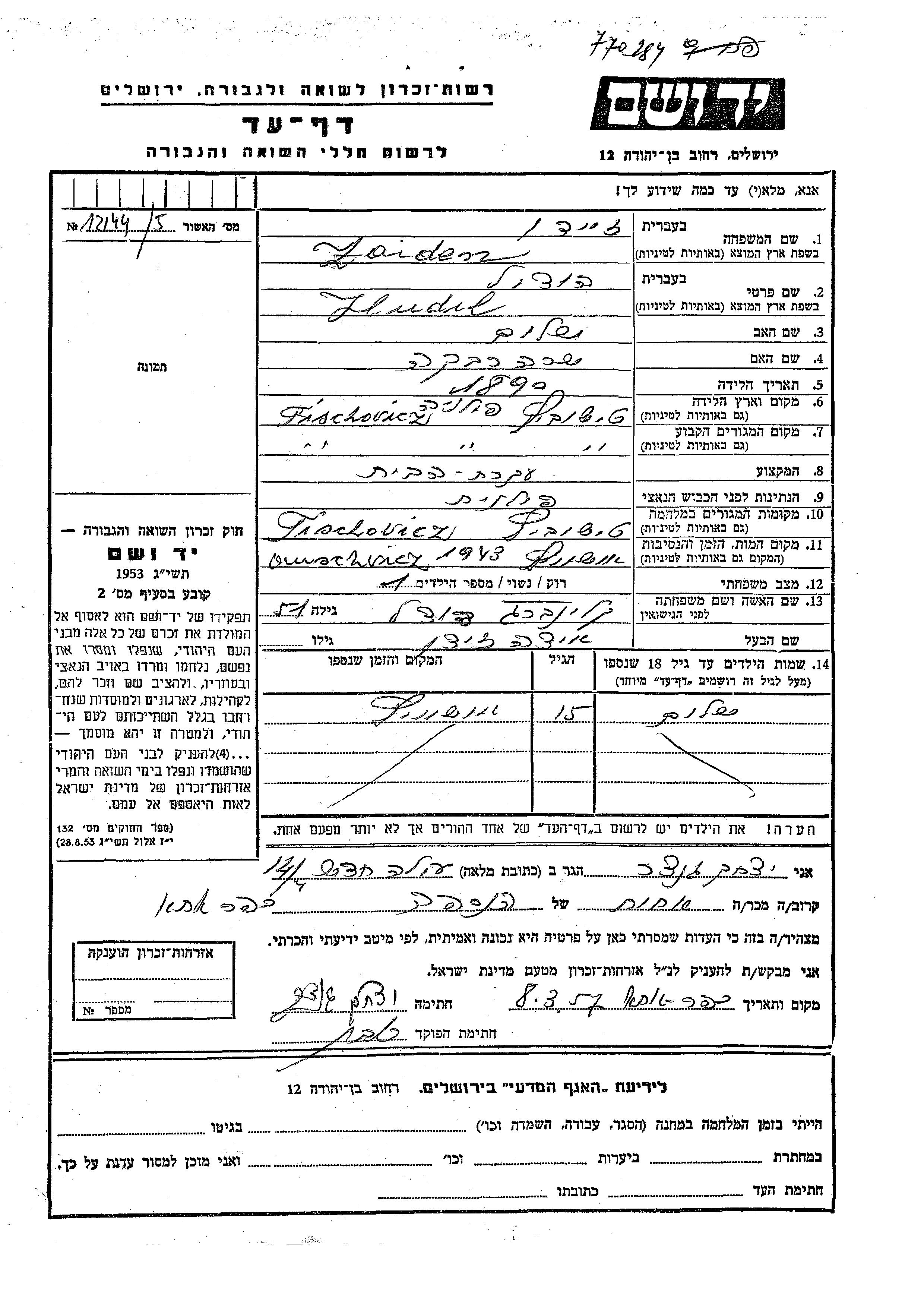Shalom Zaiden wurde Er war der Sohn von Ida und Hudil, geb. Klinberg. Er war Kind. Vor dem Zweiten Weltkrieg lebte er in Tiszowce, Polen. Während des Krieges war er in Tyszowic, Polen.