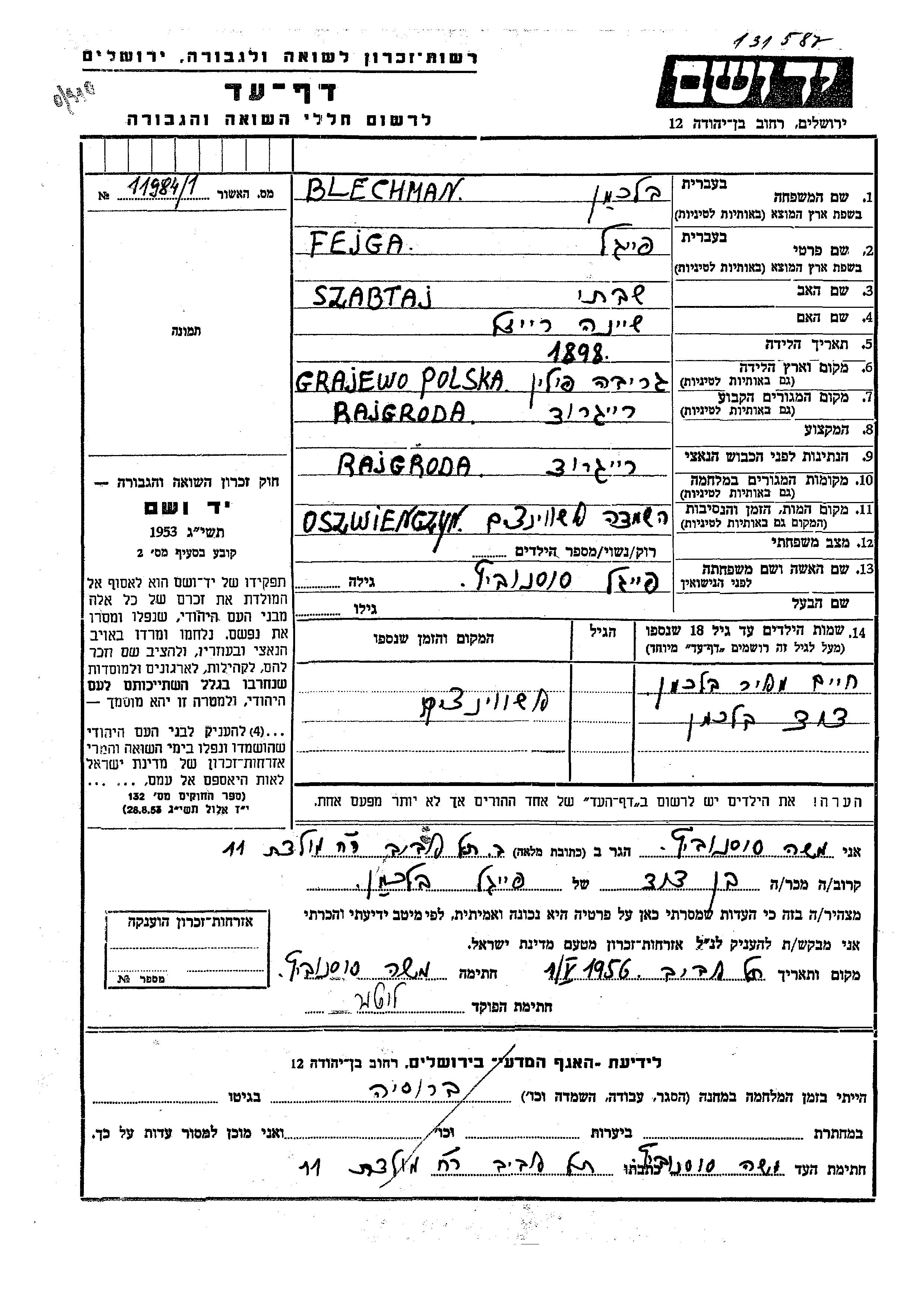 Khaim Meir Blechman wurde Er war der Sohn von Fejga, geb. Sosnovitz. Er war Kind. Vor dem Zweiten Weltkrieg lebte er in Rajgrod, Polen.