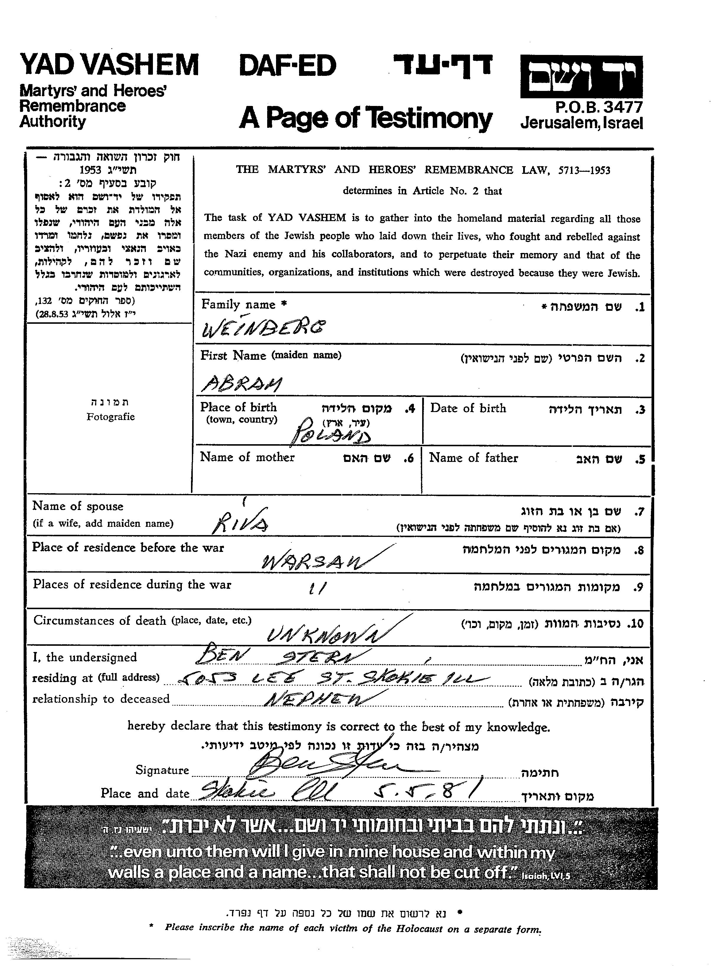 Abram Weinberg wurde in Polen geboren. Er war mit Riva Verheiratet. Vor dem Zweiten Weltkrieg lebte er in Warsaw, Polen. Während des Krieges war er in Warsaw, Polen.