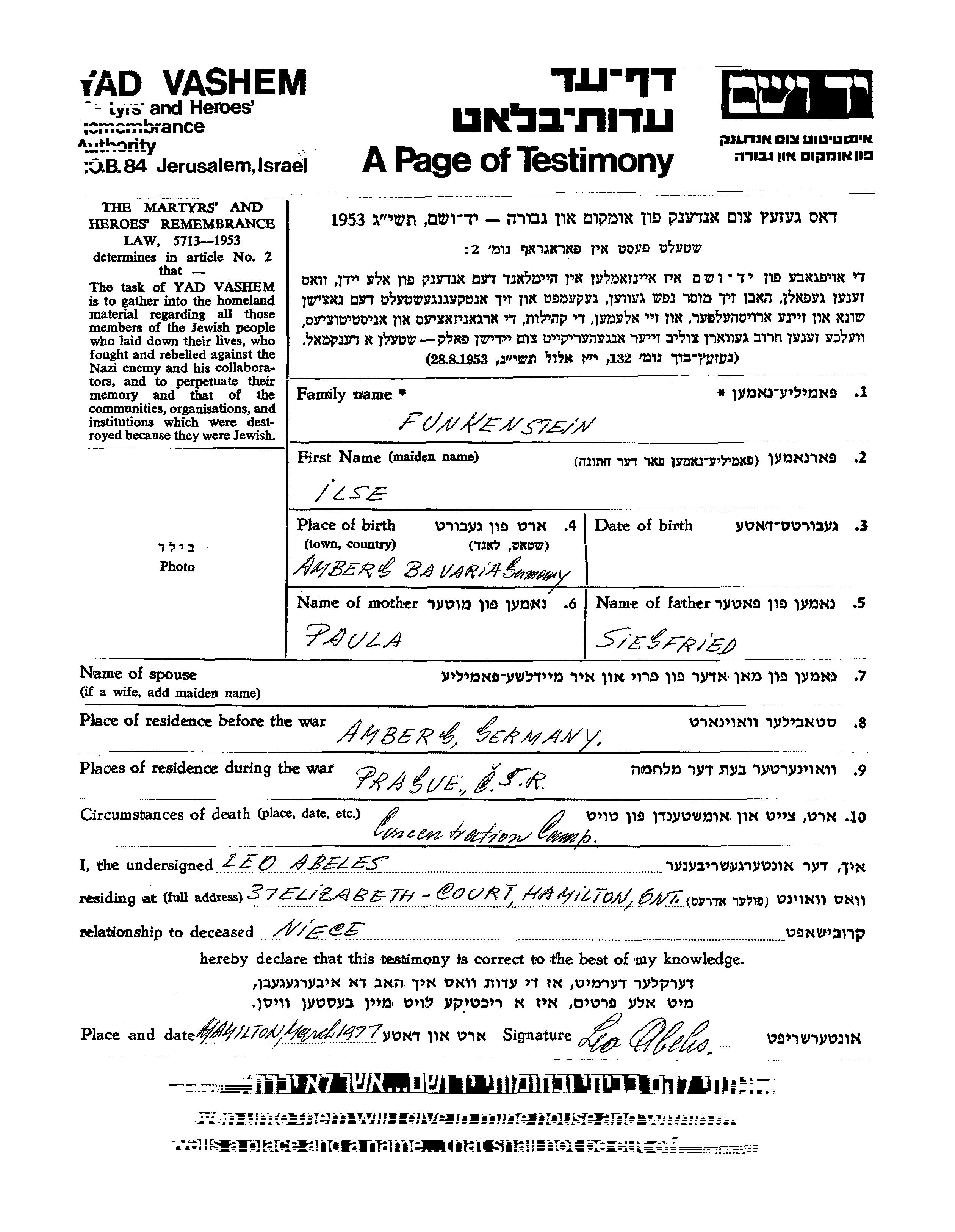 Ilse Funkenstein wurde in Amberg, Deutsches Reich geboren. Sie war die Tochter von Siegfried und Paula. Vor dem Zweiten Weltkrieg lebte sie in Amberg, Deutsches Reich. Während des Krieges war sie in Prague, Tschechoslowakei.
