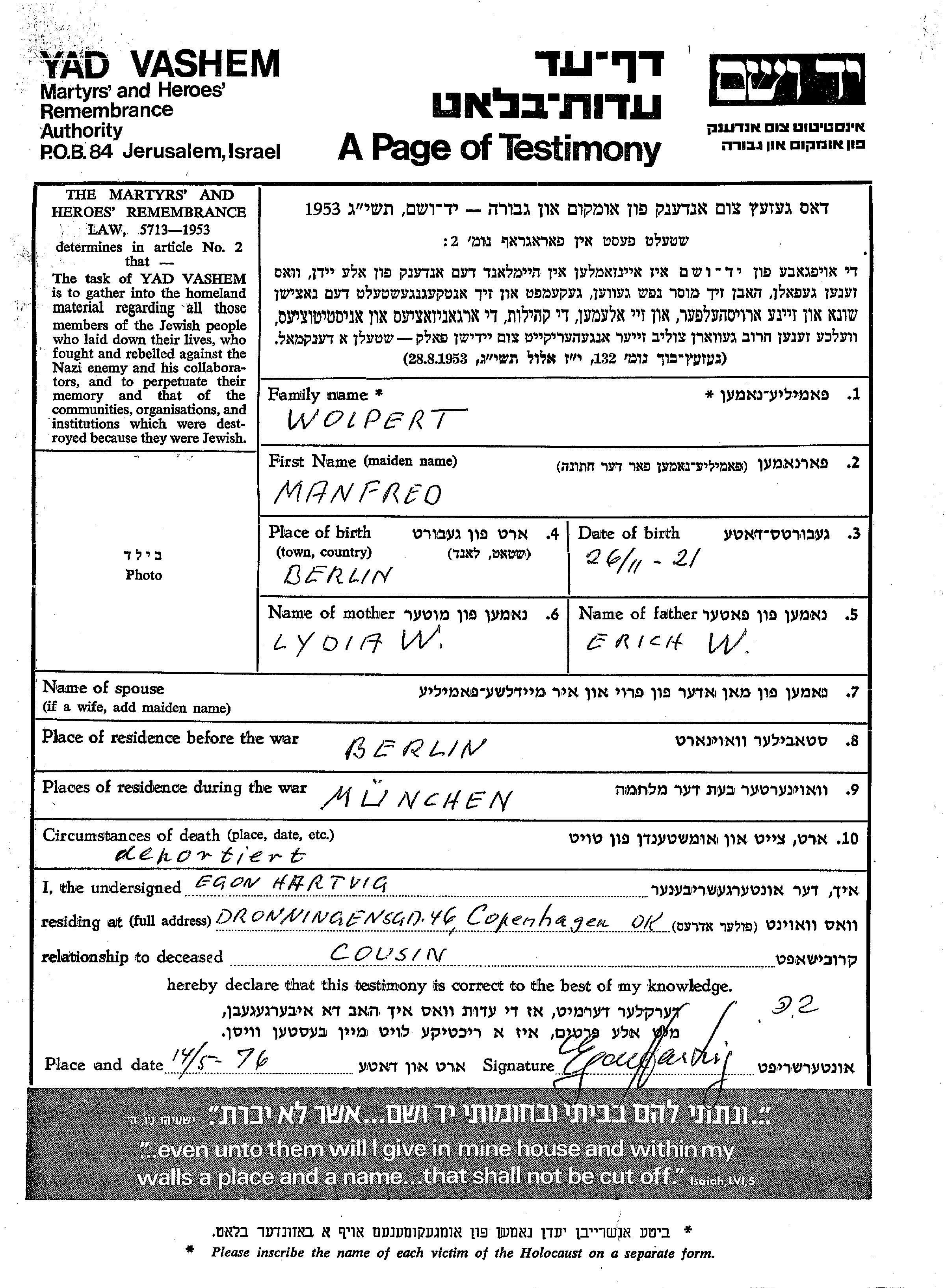 Manfred Wolpert wurde im Jahr 1921 in Berlin, Deutsches Reich geboren. Er war der Sohn von Erich und Lydia. Vor dem Zweiten Weltkrieg lebte er in Berlin, Deutsches Reich. Während des Krieges war er in Munchen, Deutsches Reich.