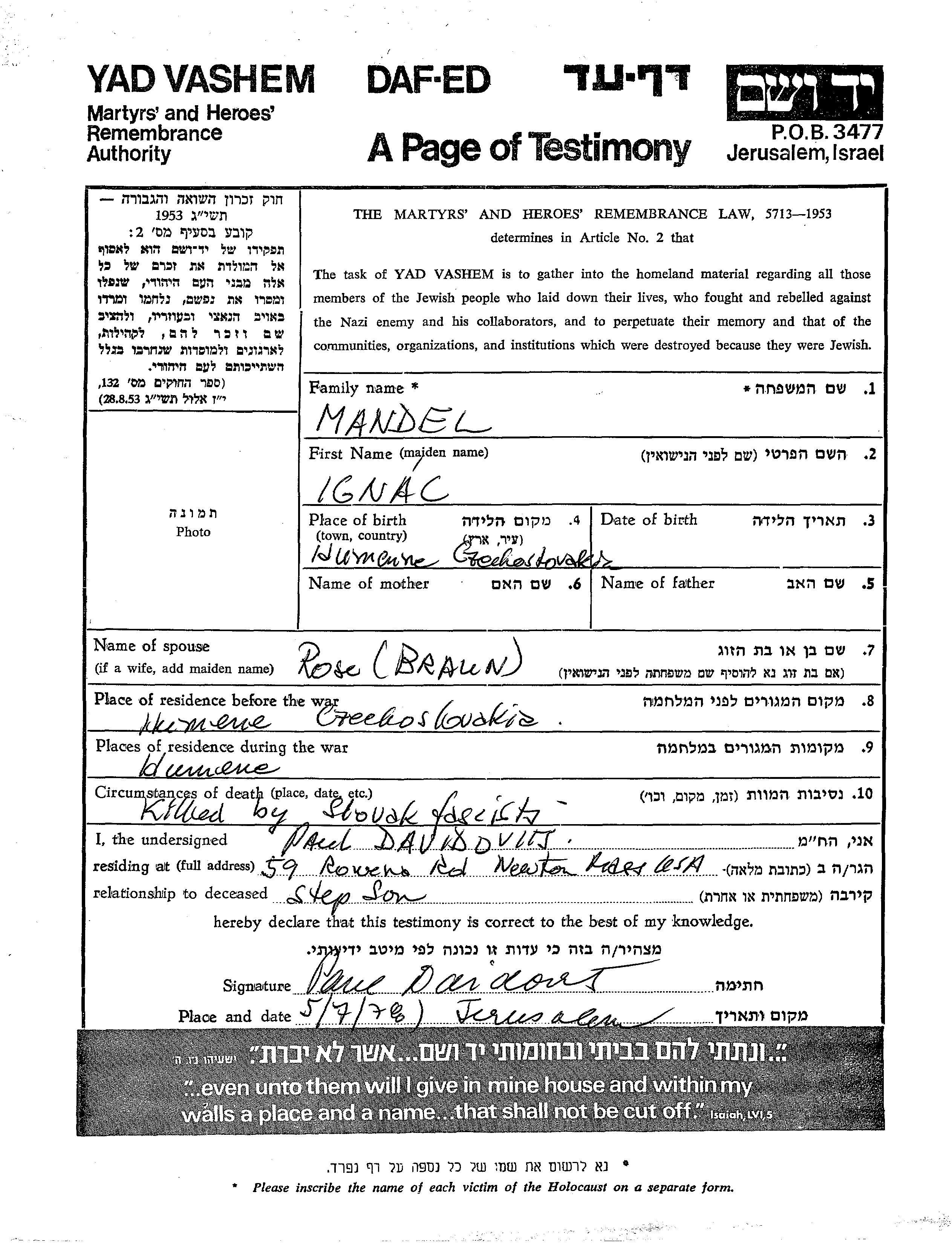 Ignac Mandel wurde in Humenne, Tschechoslowakei geboren. Vor dem Zweiten Weltkrieg lebte er in Humene, Tschechoslowakei. Während des Krieges war er in Humene, Tschechoslowakei.