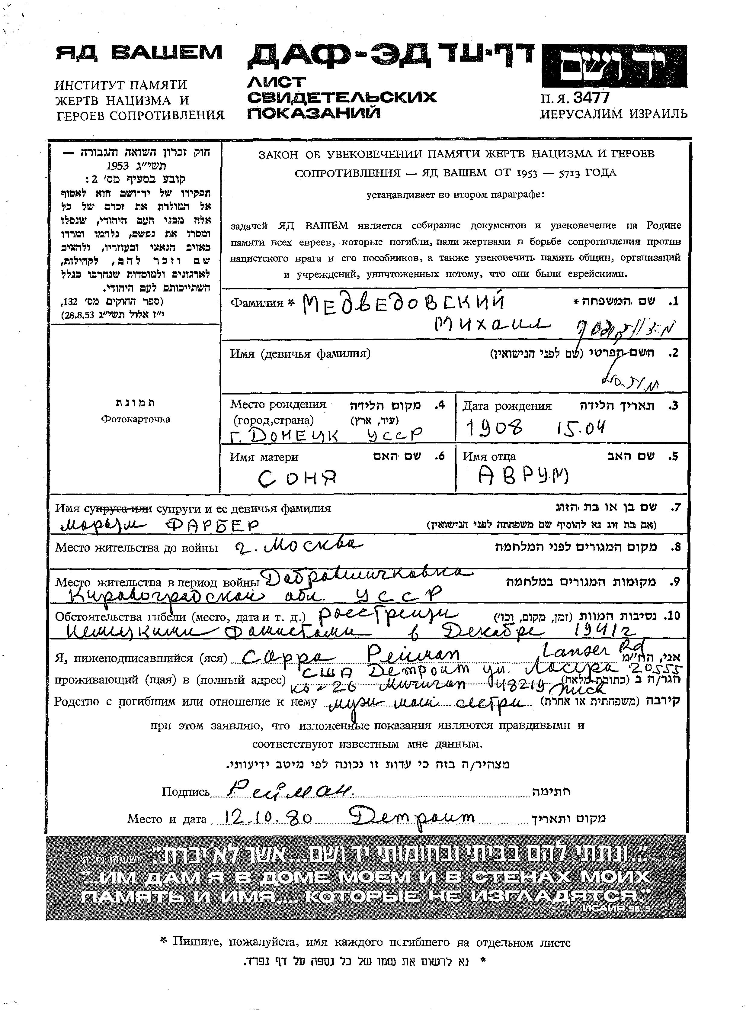 Mikhail Medvedovski wurde im Jahr 1908 in Donetsk, Ukraine (UdSSR) geboren. Er war der Sohn von Avrum und Sonya. Er war mit Maryam, geb. Farber Verheiratet. Vor dem Zweiten Weltkrieg lebte er in Moskva, Russland (UdSSR). Während des Krieges war er in Dobrovelichkivka, Ukraine (UdSSR).