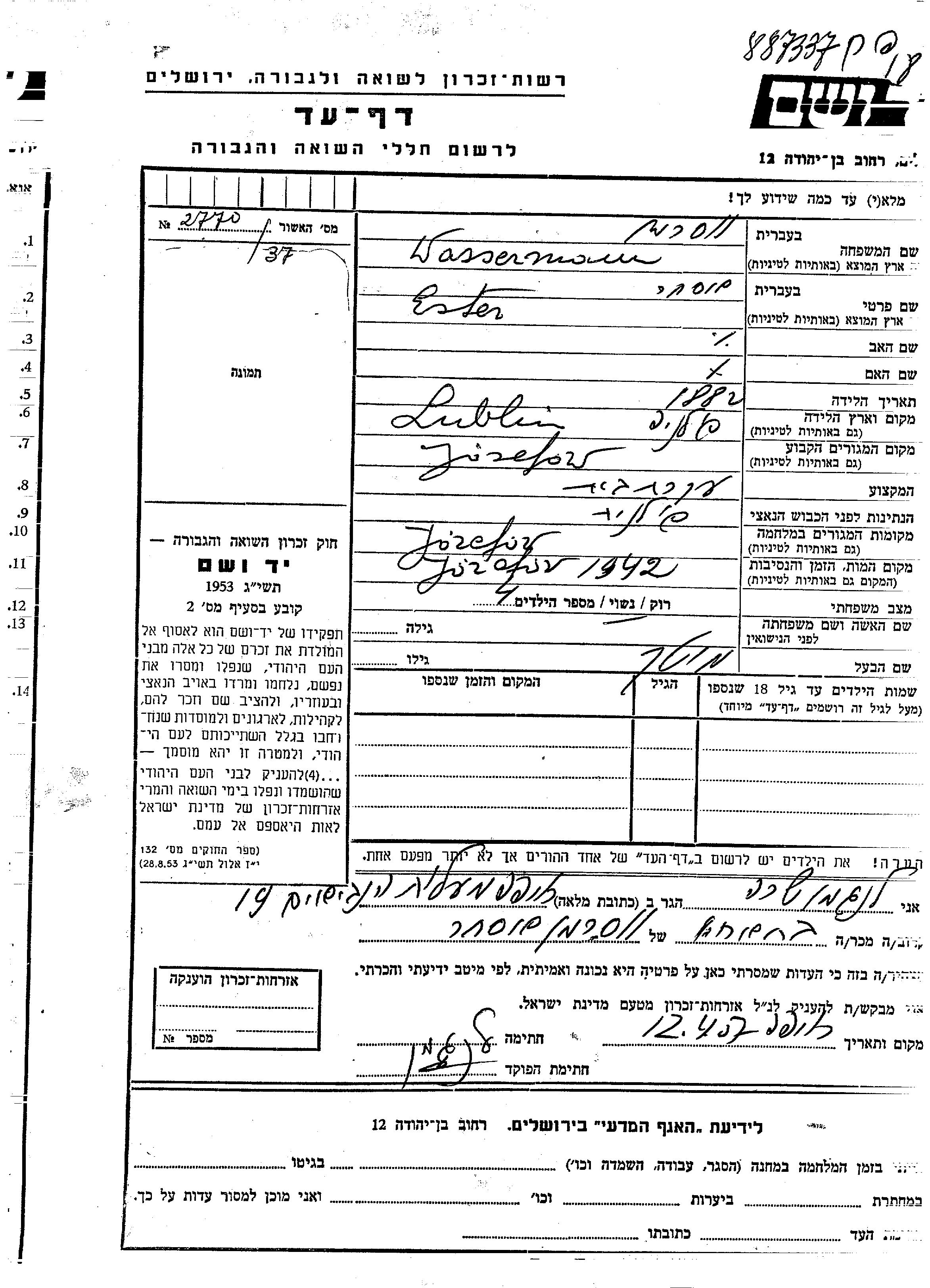Ester Wasserman wurde im Jahr 1882 in Lublin, Polen geboren. Sie war Hausfrau und mit Motek Verheiratet. Vor dem Zweiten Weltkrieg lebte sie in Jozefow, Polen. Während des Krieges war sie in Jozefow, Polen.