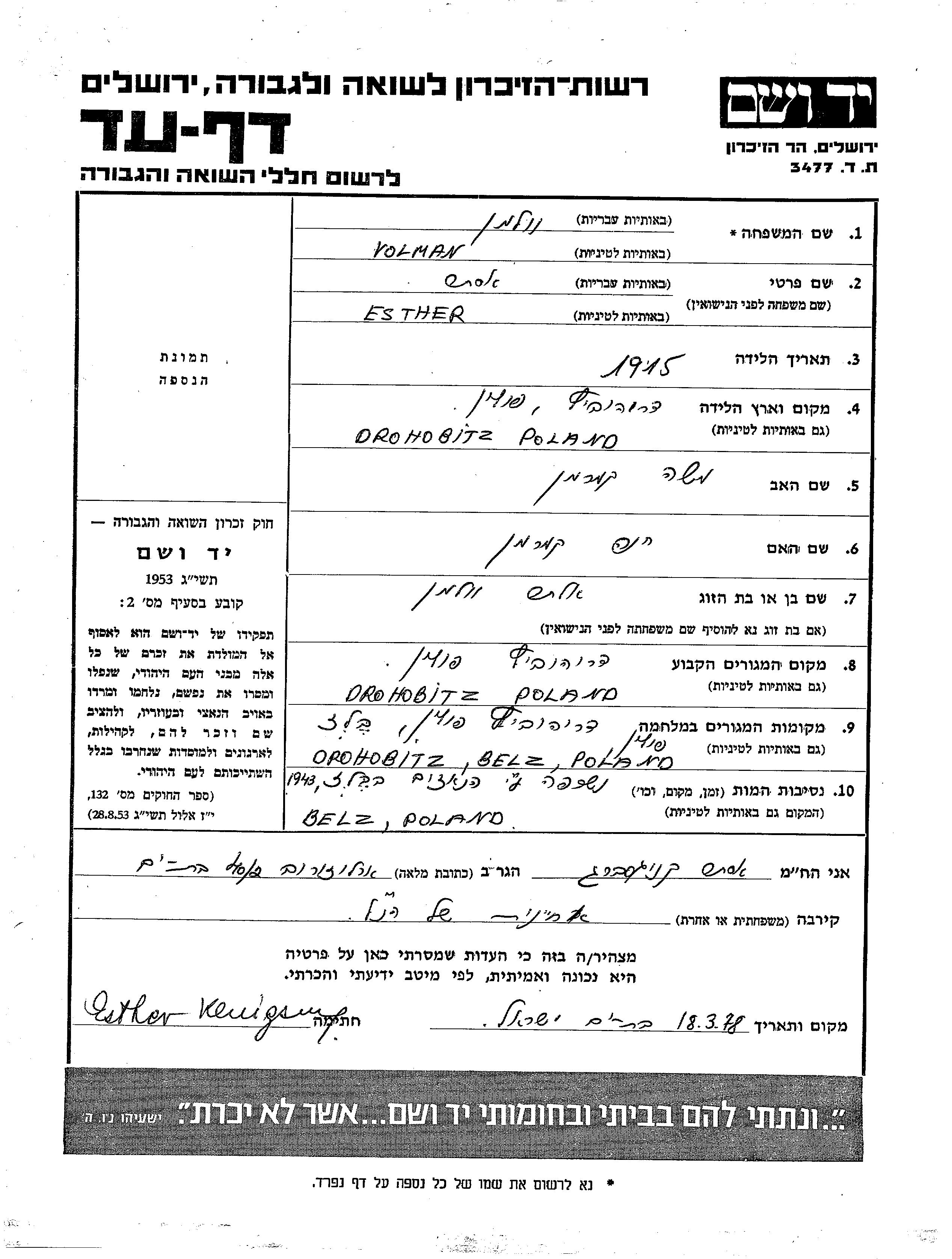 Esther Volman, geb. Kamerman wurde im Jahr 1915 in Drohobycz, Polen geboren. Sie war die Tochter von Moshe und Khana. Sie war mit Alter Verheiratet. Vor dem Zweiten Weltkrieg lebte sie in Drohobycz, Polen. Während des Krieges war sie in Drohobycz, Polen.