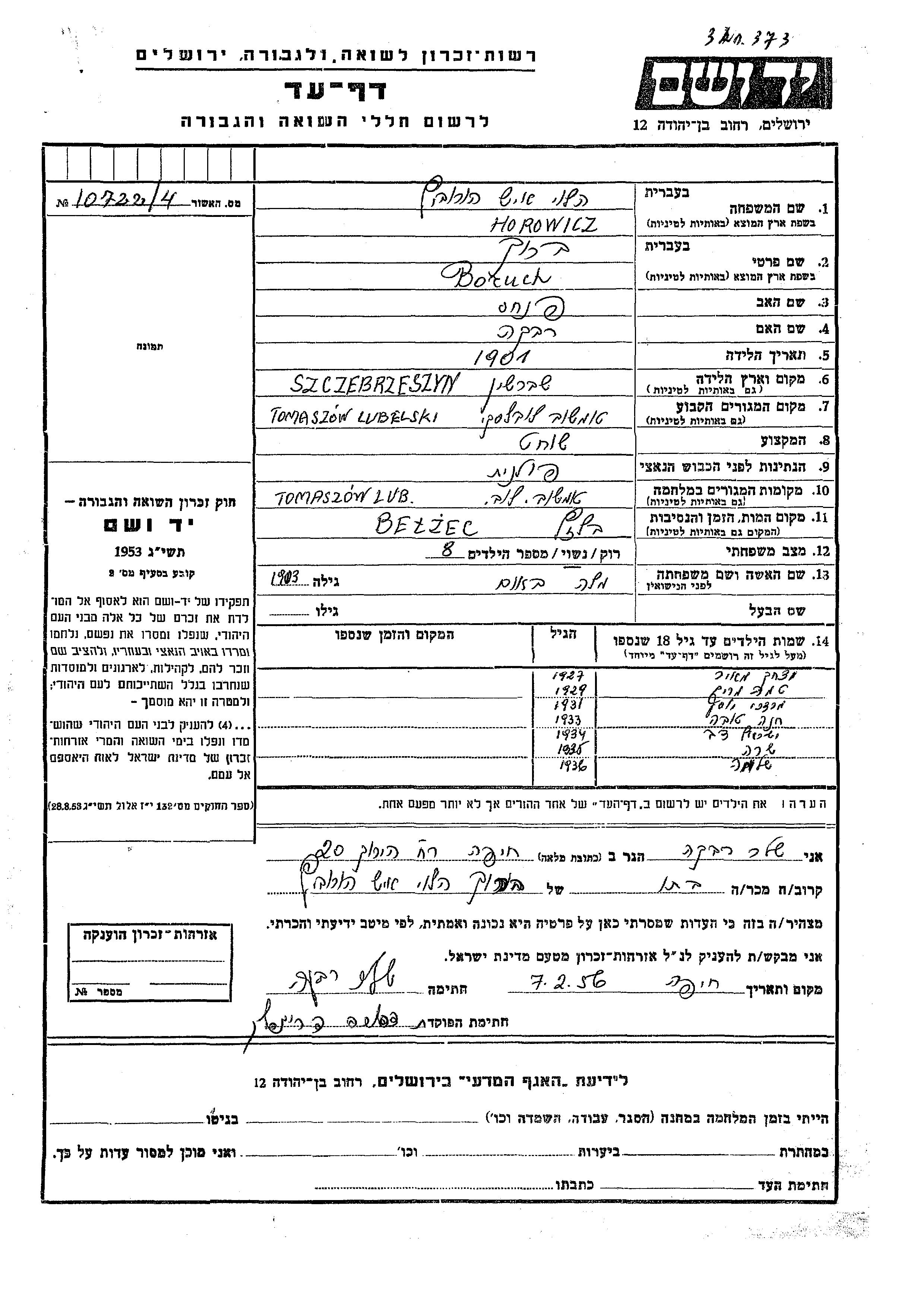 Yisrael Dov Horowicz Halevi wurde im Jahr 1934 geboren. Er war der Sohn von Boruch und Mala, geb. Baum. Er war Kind. Vor dem Zweiten Weltkrieg lebte er in Tomaszow Lubelski, Polen. Während des Krieges war er in Tomaszow Lubelski, Polen.