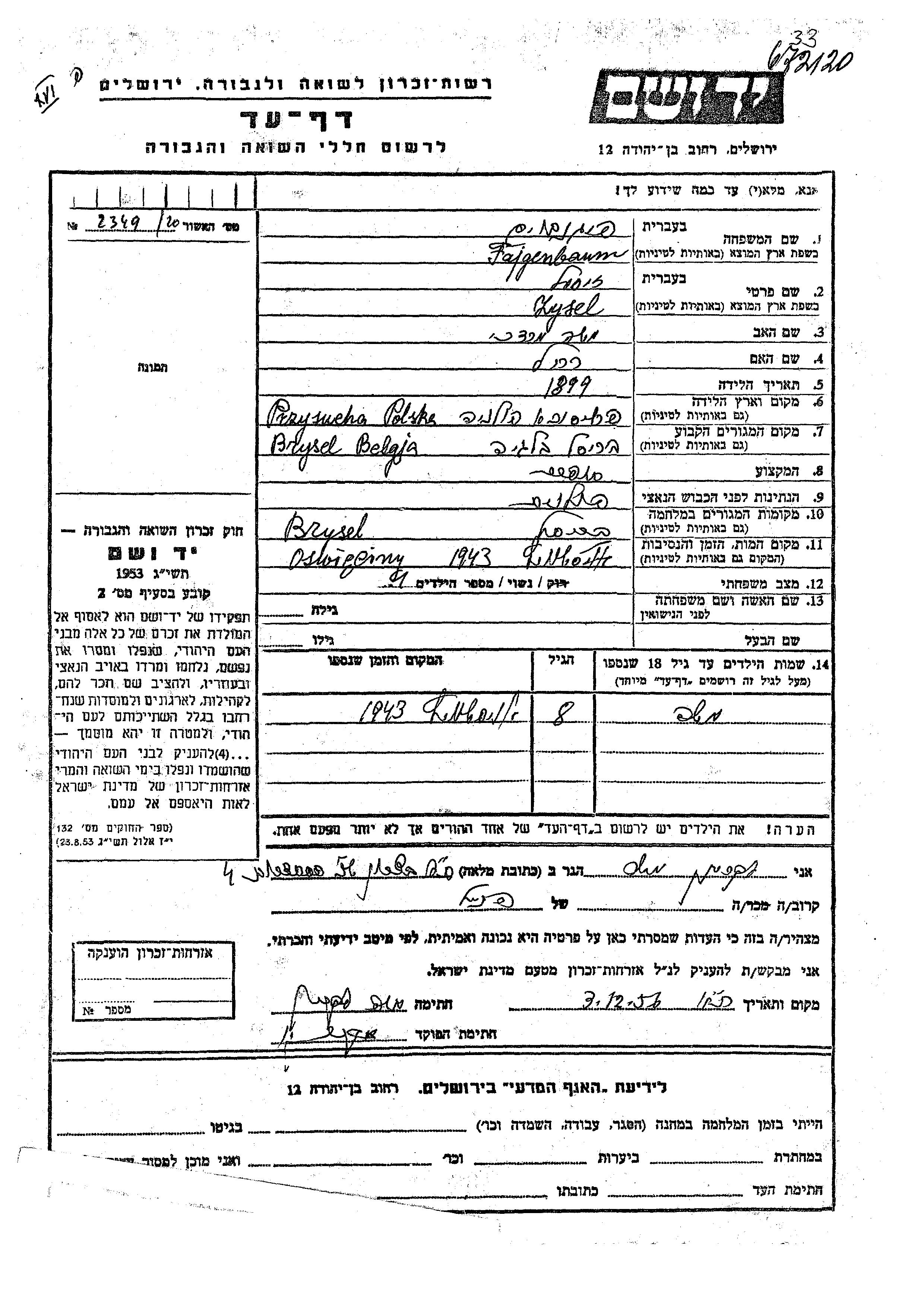 Fajgenbaum Moshe Bruxelles, Belgien Gedenkblatt