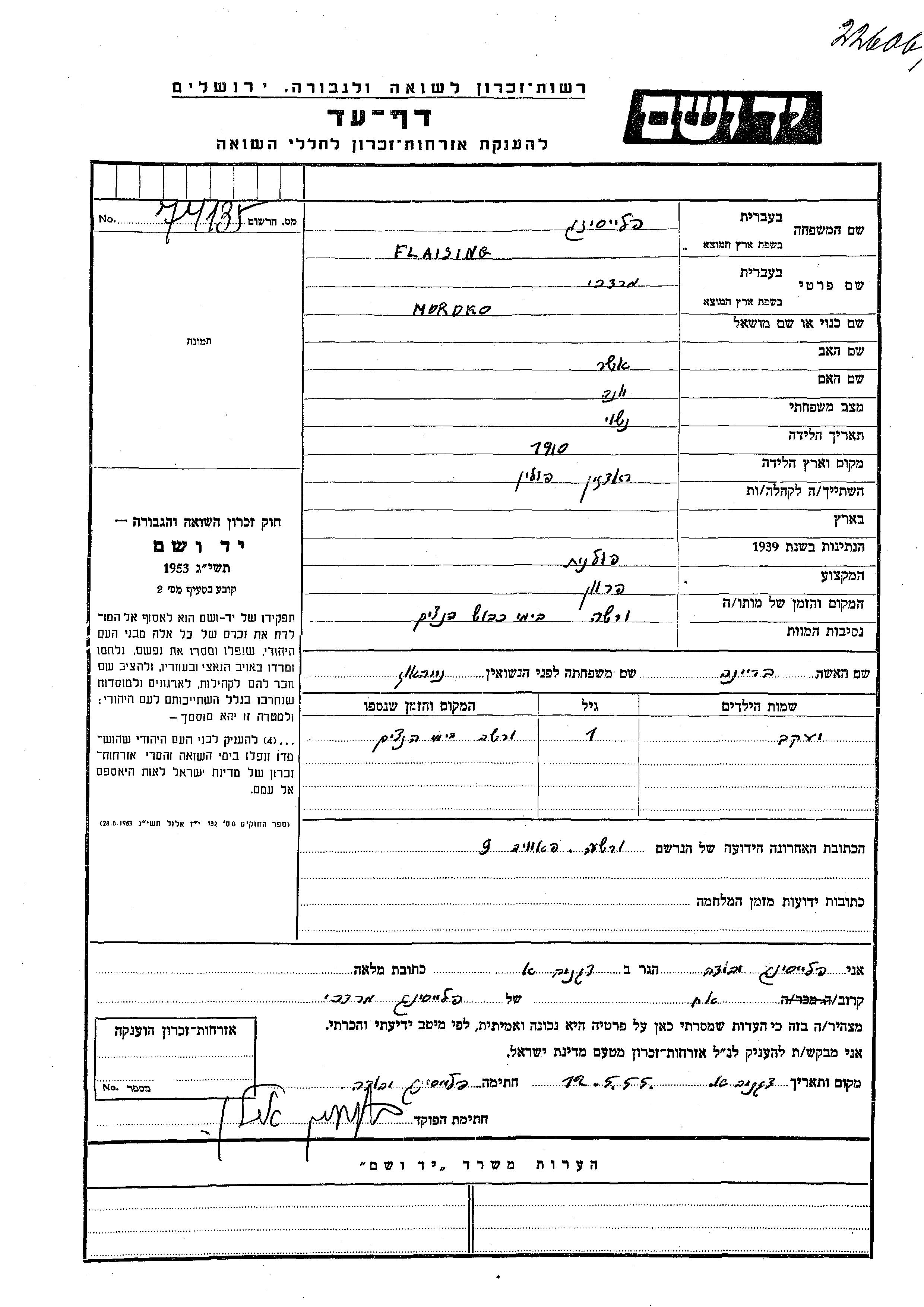 Yaakov Flaising wurde Er war der Sohn von Mordko und Breina, geb. Neihauz. Er war Kind.