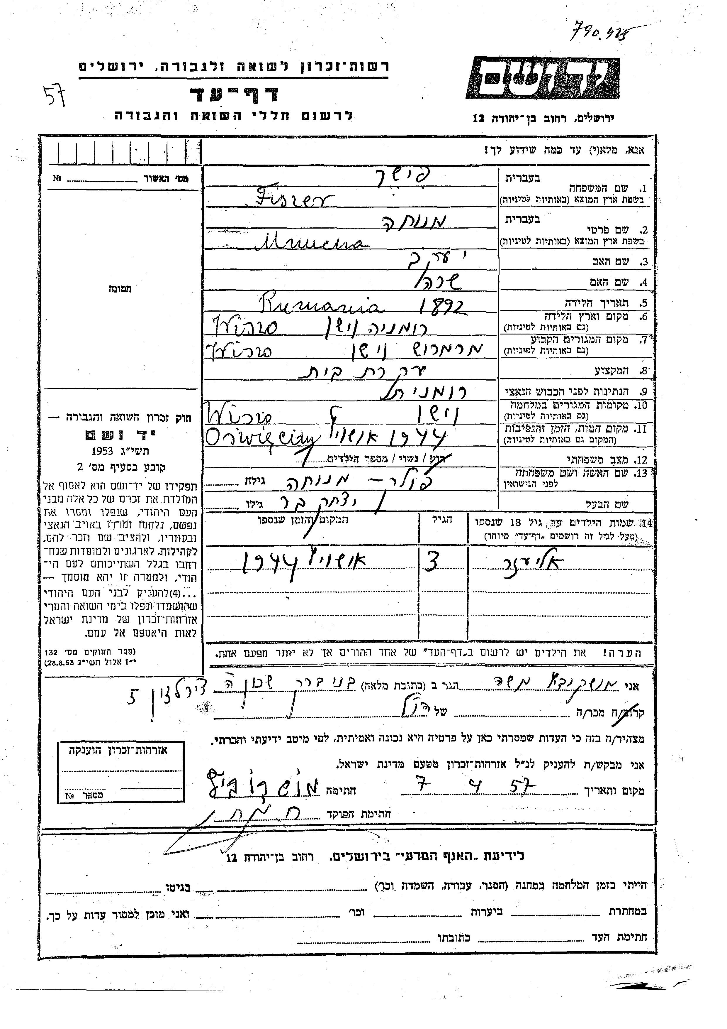 Eliezer Fiszer wurde Er war der Sohn von Yitzkhak Ber und Mnucha, geb. Polak. Er war Kind. Vor dem Zweiten Weltkrieg lebte er in Wiszo, Rumänien. Während des Krieges war er in Wiszo, Rumänien.