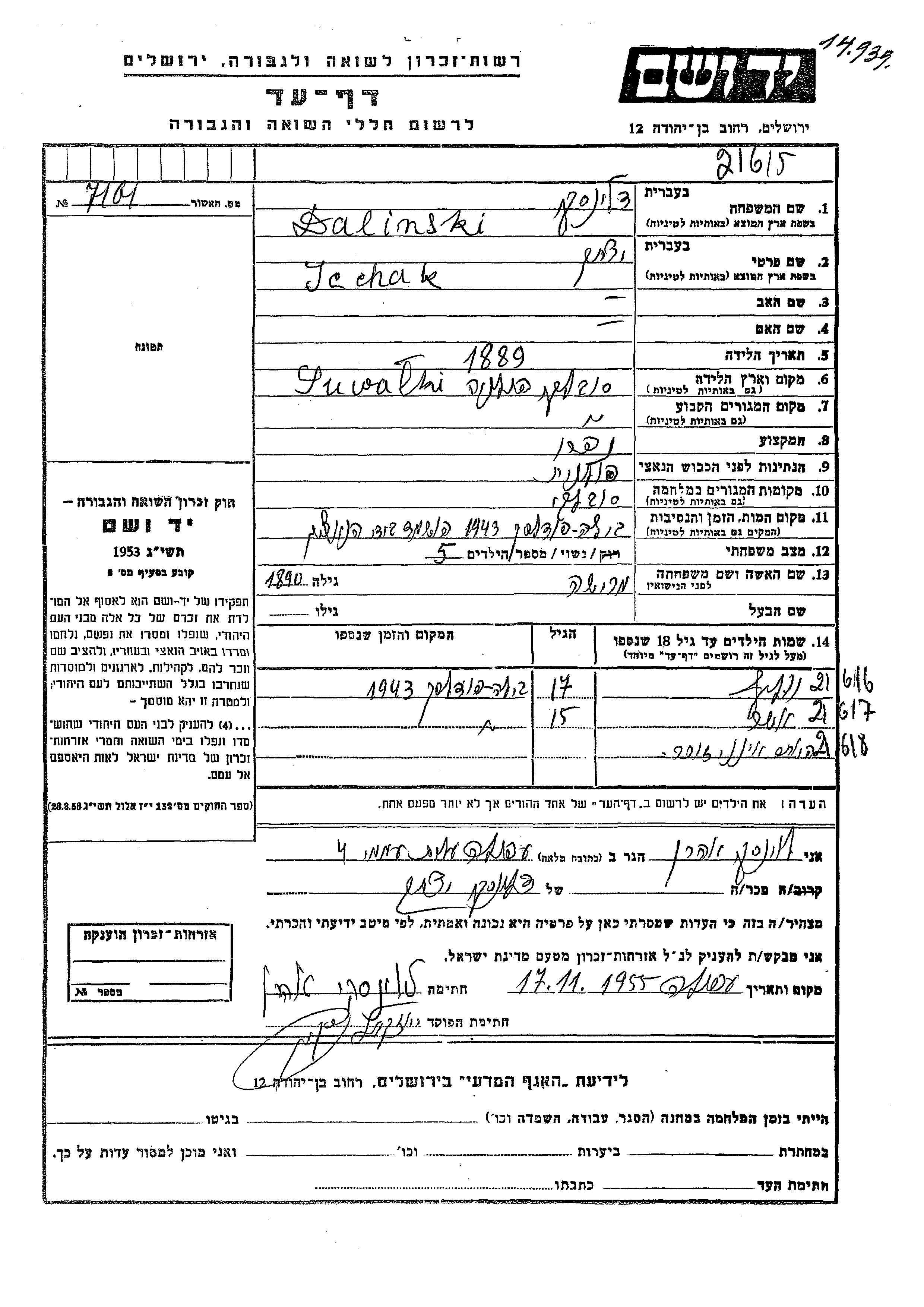 Asher Dalinski Delinski wurde Er war der Sohn von Jcchak und Marisha. Er war Kind. Vor dem Zweiten Weltkrieg lebte er in Suwalki, Polen. Während des Krieges war er in Suwalki, Polen.