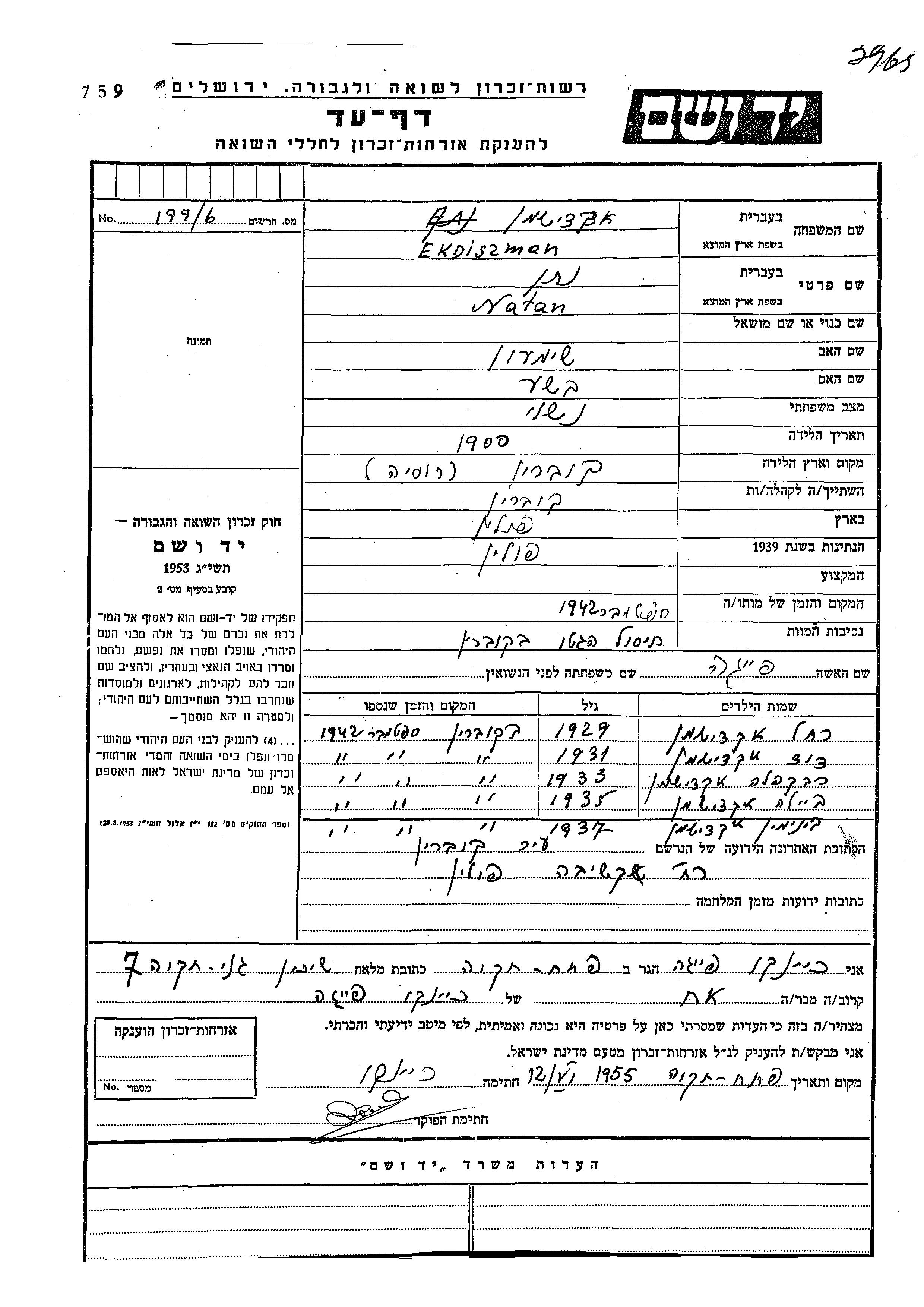 Rivka Ekdiszman wurde Sie war die Tochter von Natan und Feiga. Sie war Kind. Vor dem Zweiten Weltkrieg lebte sie in Kobrin, Polen. Während des Krieges war sie in Kobrin, Polen.