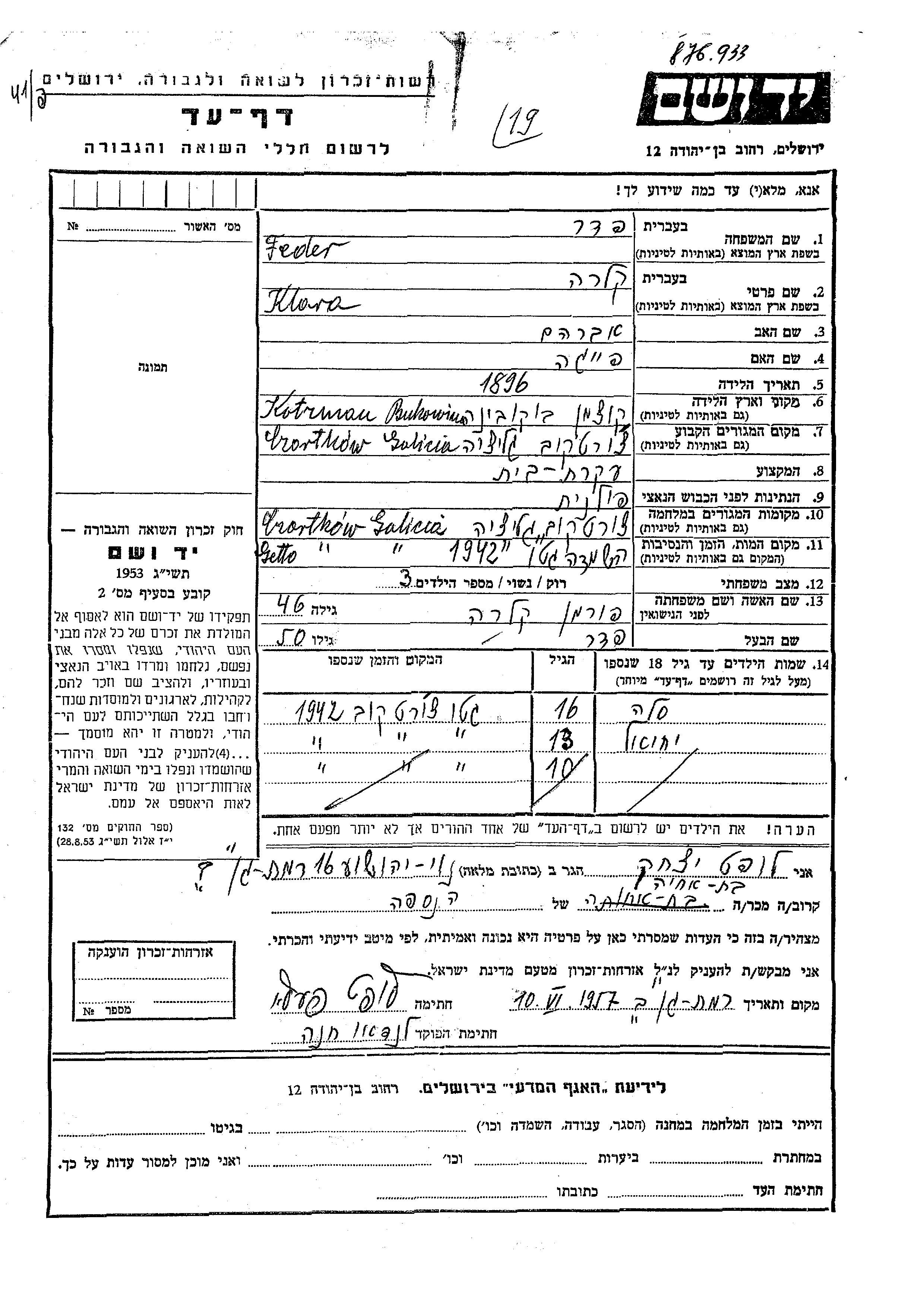 Yekhiel Feder wurde Er war der Sohn von Klara, geb. Furman. Er war Kind. Vor dem Zweiten Weltkrieg lebte er in Czortkow, Polen. Während des Krieges war er in Czortkow, Polen.