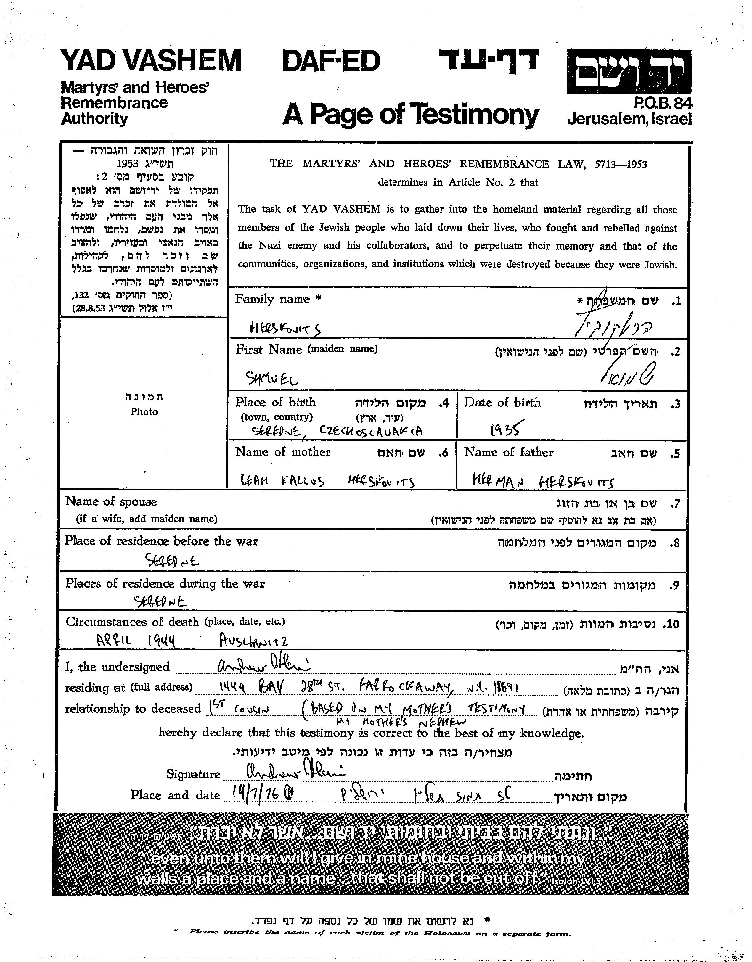 Shmuel Herskovits Herkovitz wurde im Jahr 1935 in Seredne, Tschechoslowakei geboren. Er war der Sohn von Herman und Leah. Vor dem Zweiten Weltkrieg lebte er in Seredne, Ukraine (UdSSR). Während des Krieges war er in Seredne, Ukraine (UdSSR).
