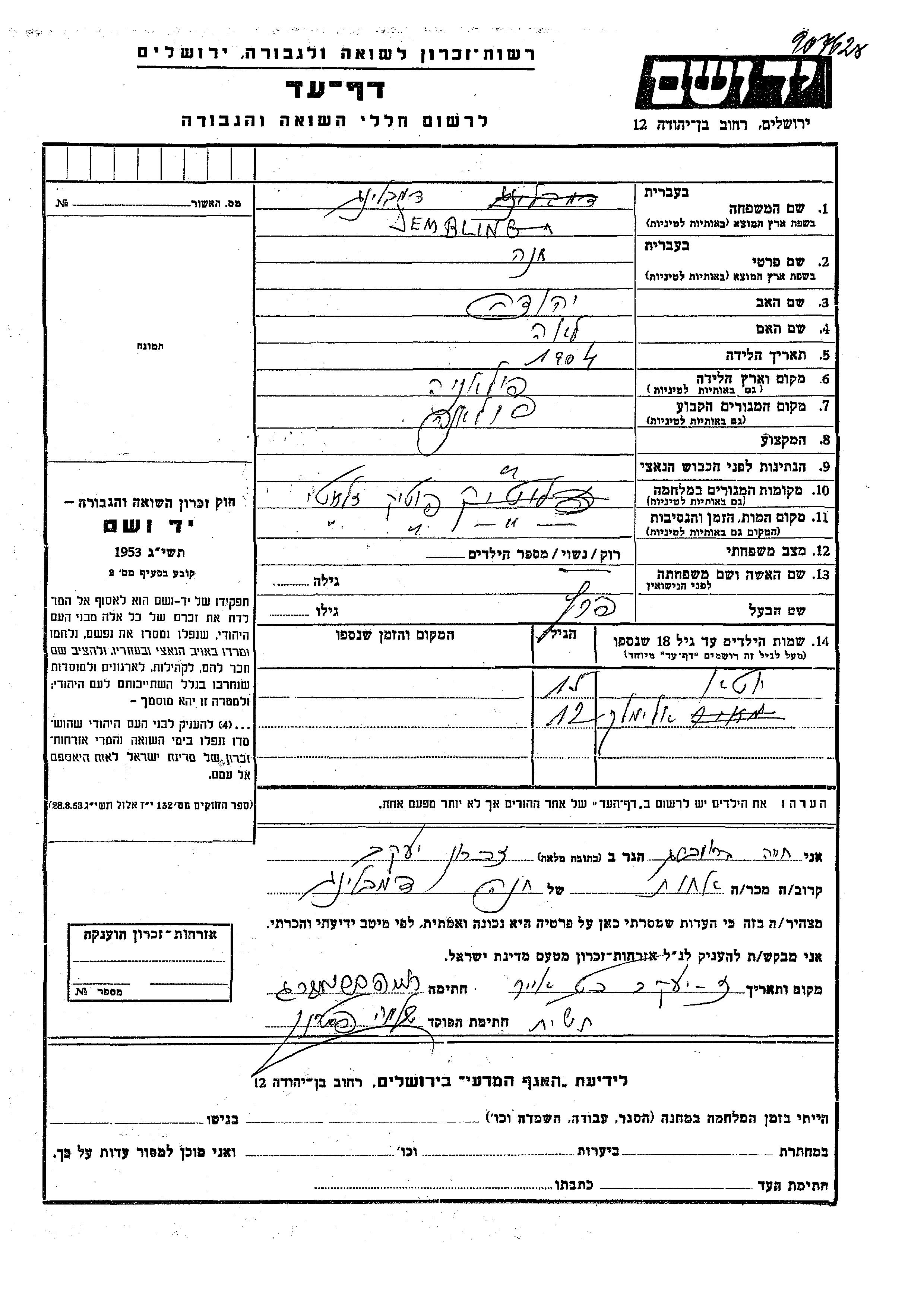 Elimelekh Dembling wurde Er war der Sohn von Peretz und Khana. Er war Kind. Vor dem Zweiten Weltkrieg lebte er in Polen. Während des Krieges war er in Potok Zloti, Polen.