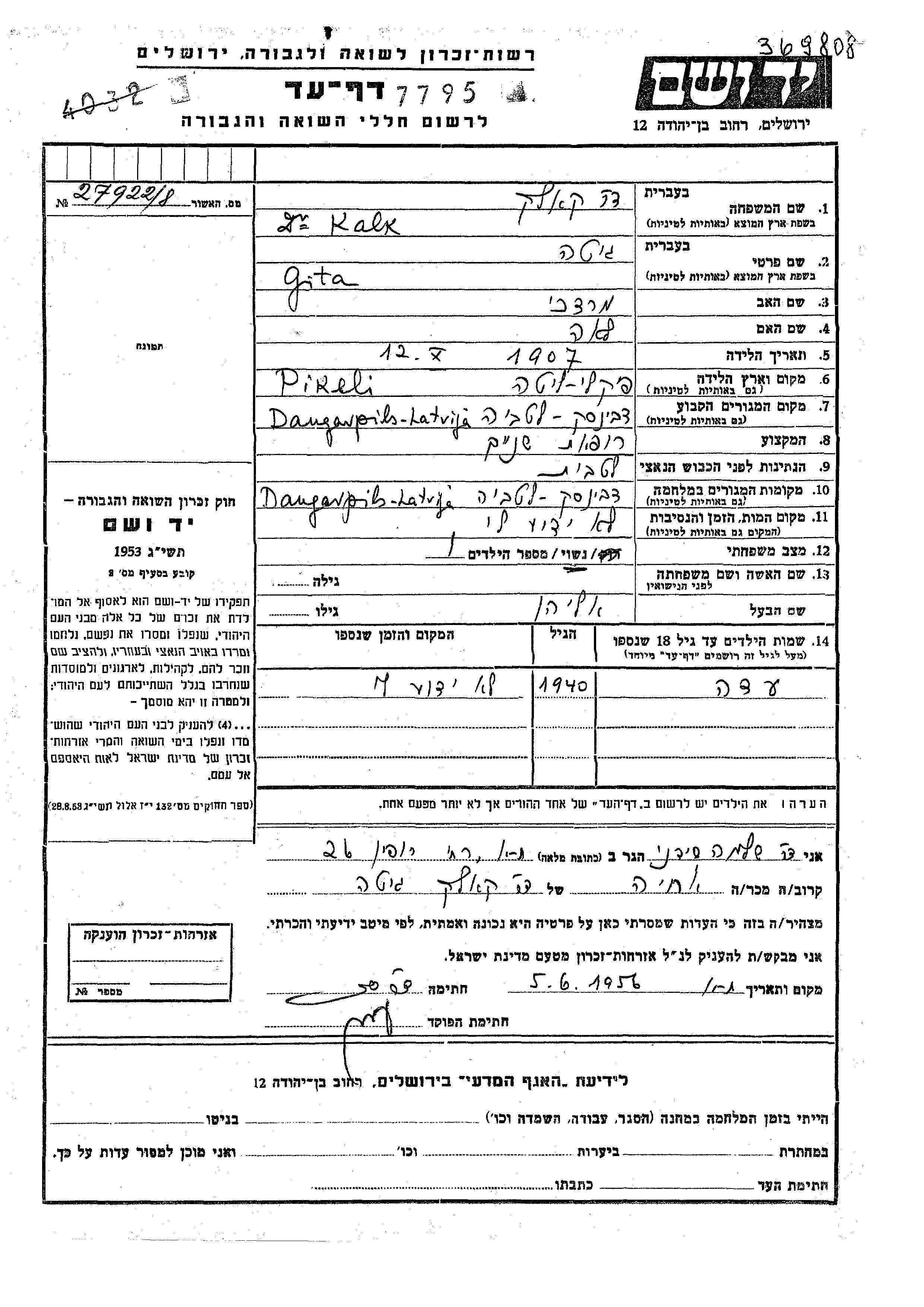 Ada Kalk wurde im Jahr 1940 geboren. Sie war die Tochter von Eliahu und Gita. Sie war Kind. Vor dem Zweiten Weltkrieg lebte sie in Daugavpils, Lettland. Während des Krieges war sie in Daugavpils, Lettland.
