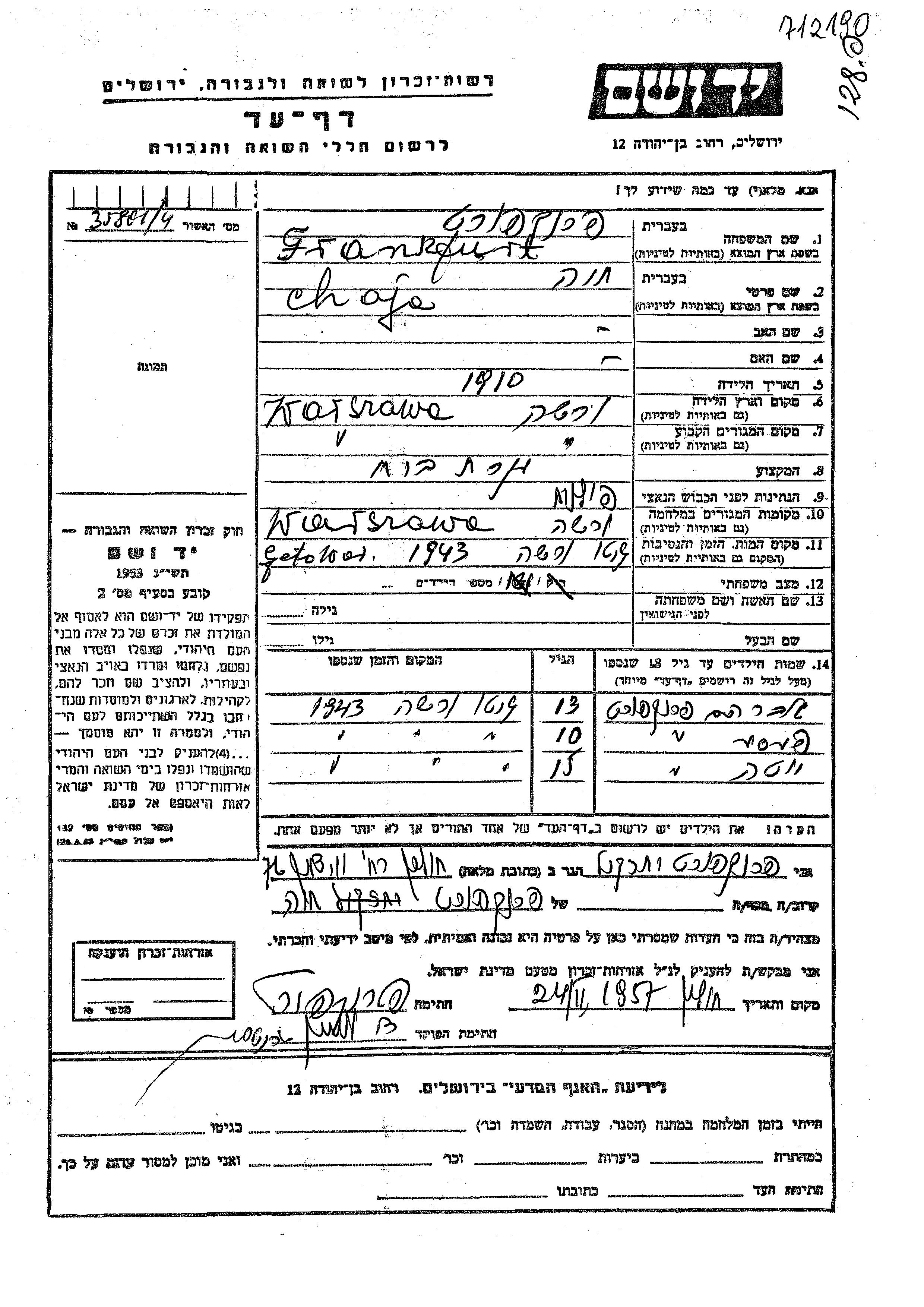 Pesie Frankfurt wurde Sie war die Tochter von Chaja. Sie war Kind. Vor dem Zweiten Weltkrieg lebte sie in Warszawa, Polen. Während des Krieges war sie in Warszawa, Polen.