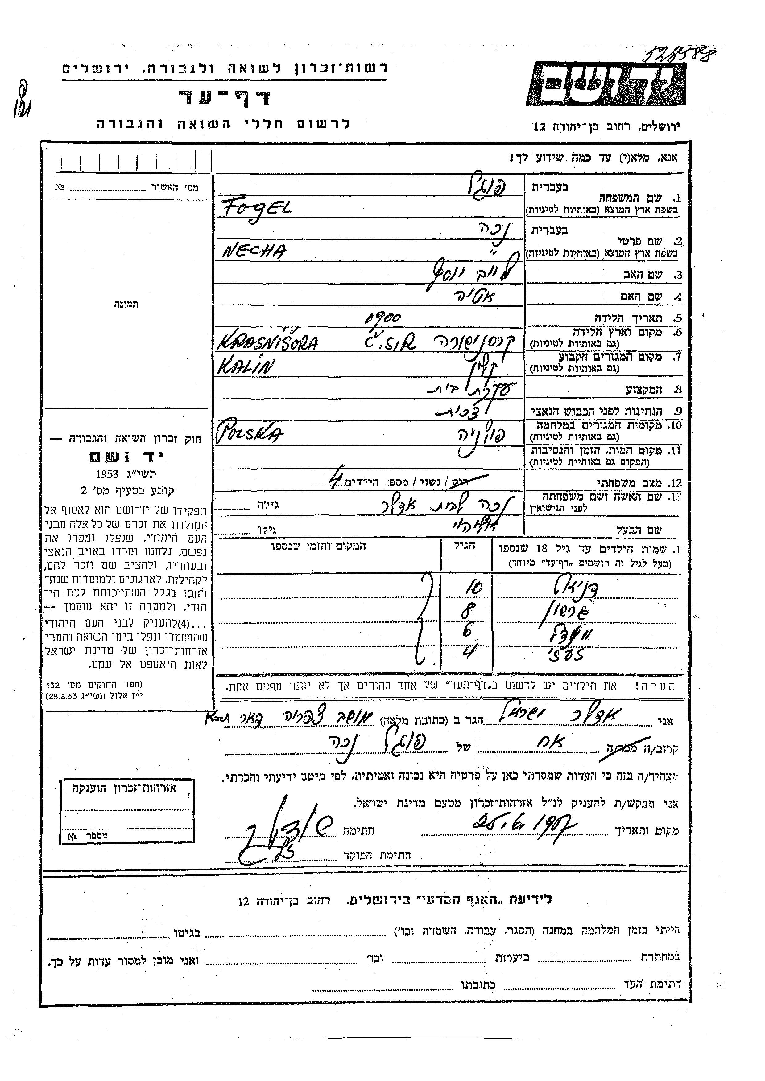 Daniel Fogel wurde Er/sie war der/ die Sohn/Tochter von Eliahu und Necha, geb. Adler. Er/Sie war Kind. Vor dem Zweiten Weltkrieg er/sie in Kalin, Tschechoslowakei. Während des Krieges war er/sie in Polen.
