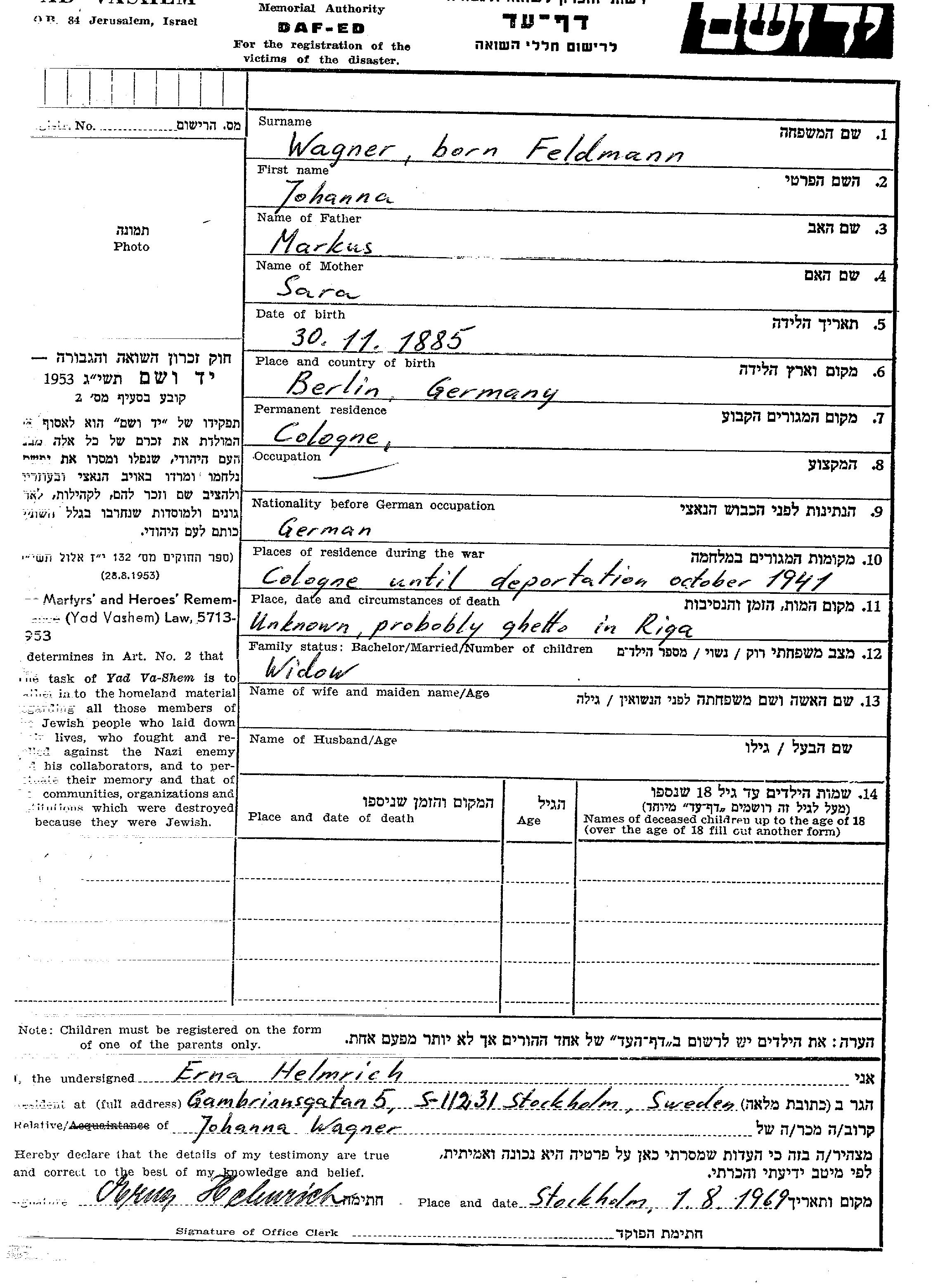 Aufenthaltsort während des Krieges/Schoah