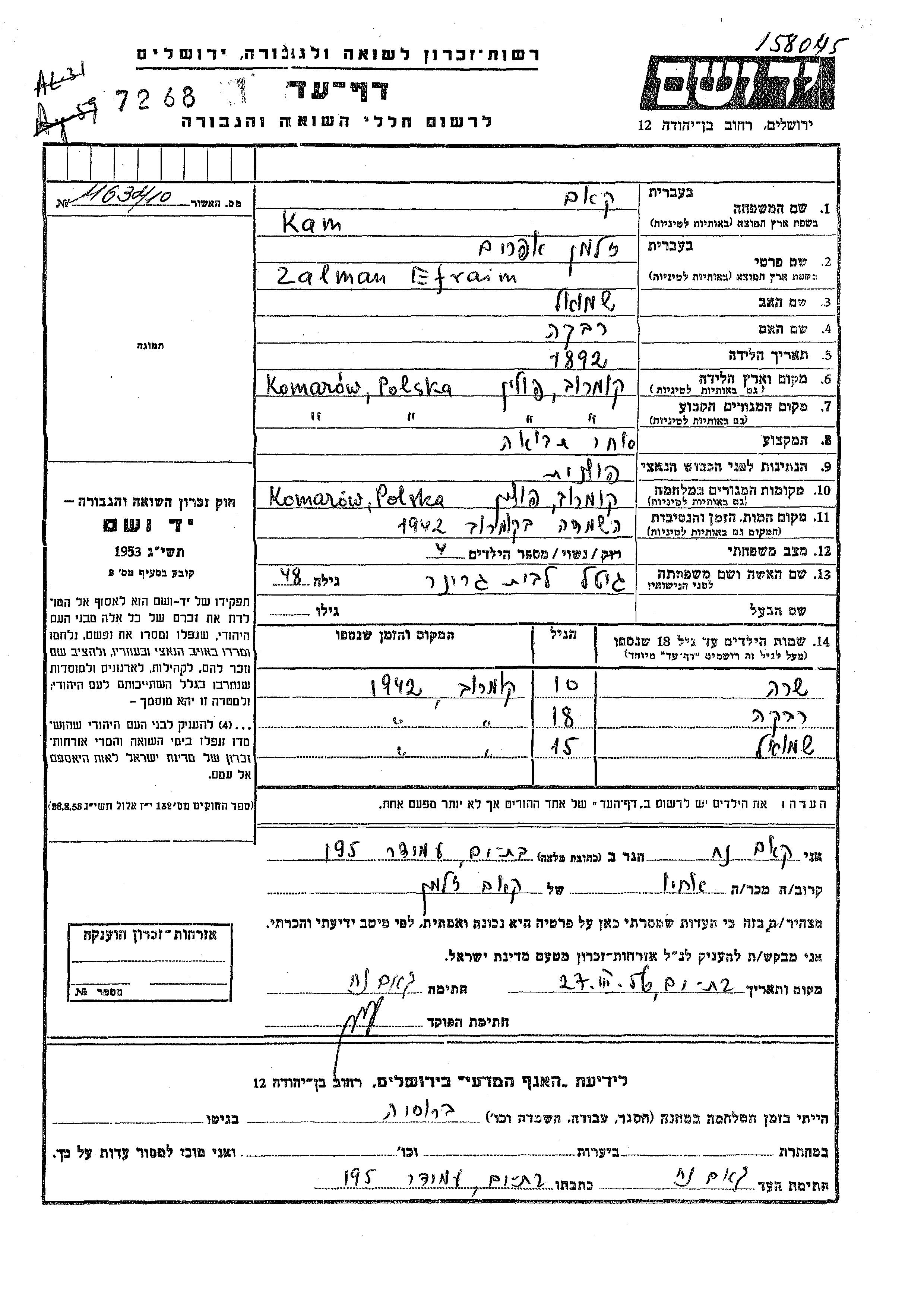 Rivka Kam wurde Sie war die Tochter von Zalman Efraim und Gitel, geb. Griner. Sie war Kind. Vor dem Zweiten Weltkrieg lebte sie in Komarow, Polen. Während des Krieges war sie in Komarow, Polen.