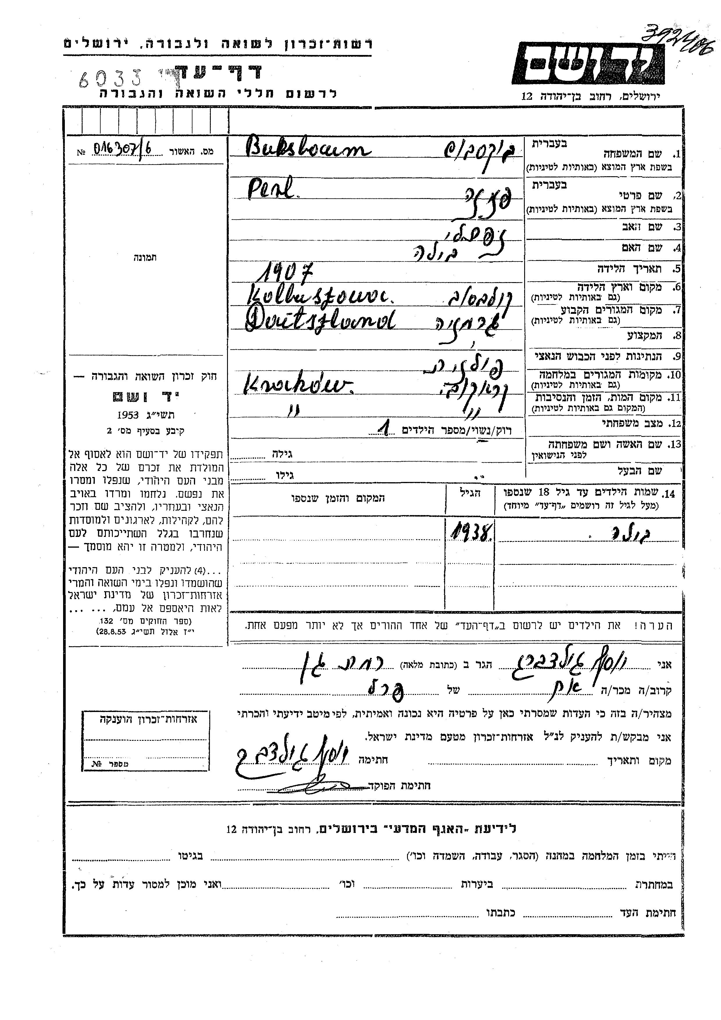 Bila Buksbaum wurde im Jahr 1938 geboren. Er/sie war der/ die Sohn/Tochter von Perl Pnina. Er/Sie war Kind. Vor dem Zweiten Weltkrieg er/sie in Deutsches Reich. Während des Krieges war er/sie in Krakow, Polen.
