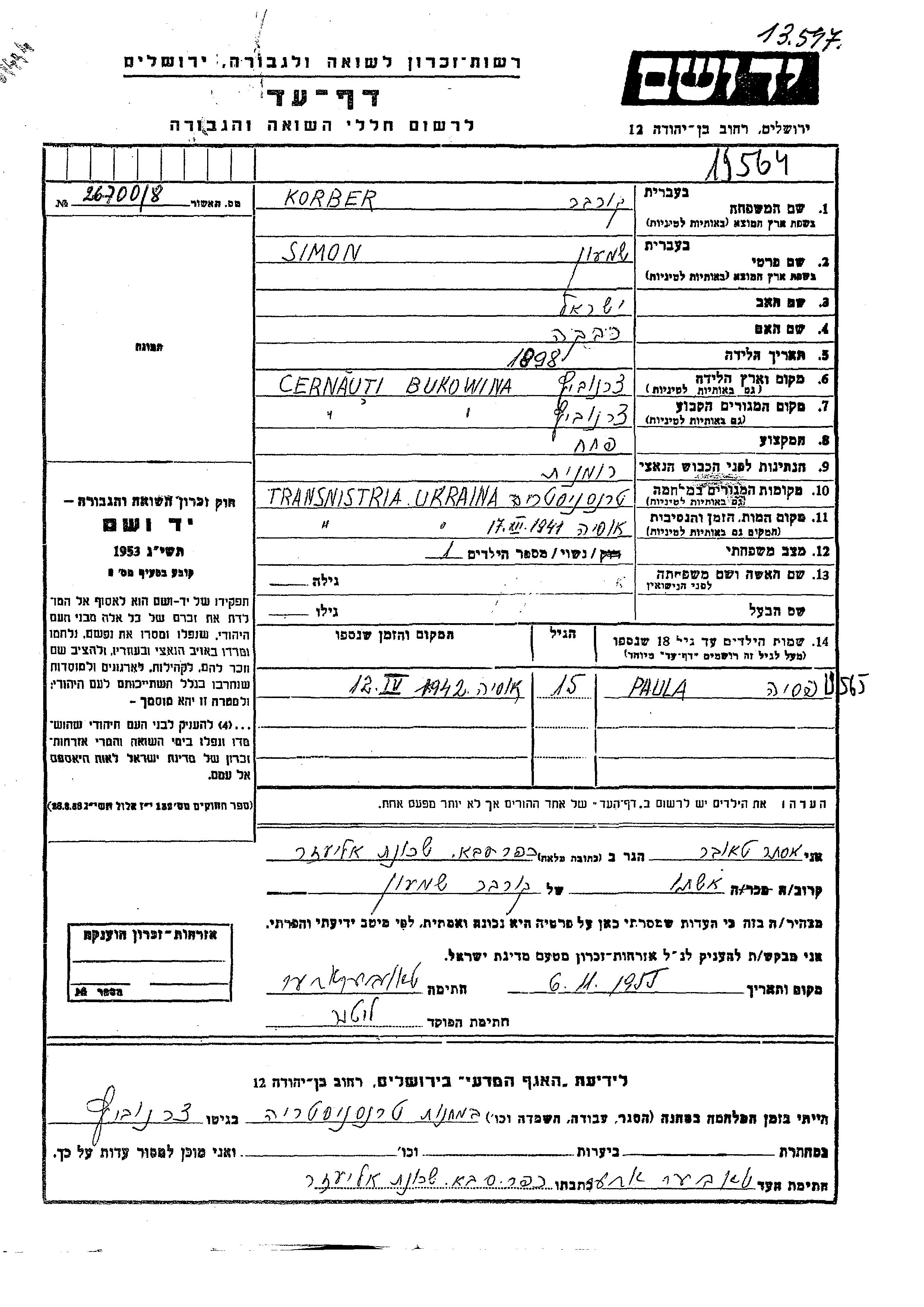 Paula Pesia Korber wurde Sie war die Tochter von Simon. Sie war Kind. Vor dem Zweiten Weltkrieg lebte sie in Cernauti, Rumänien. Während des Krieges war sie in Transnistria, Ukraine (UdSSR).