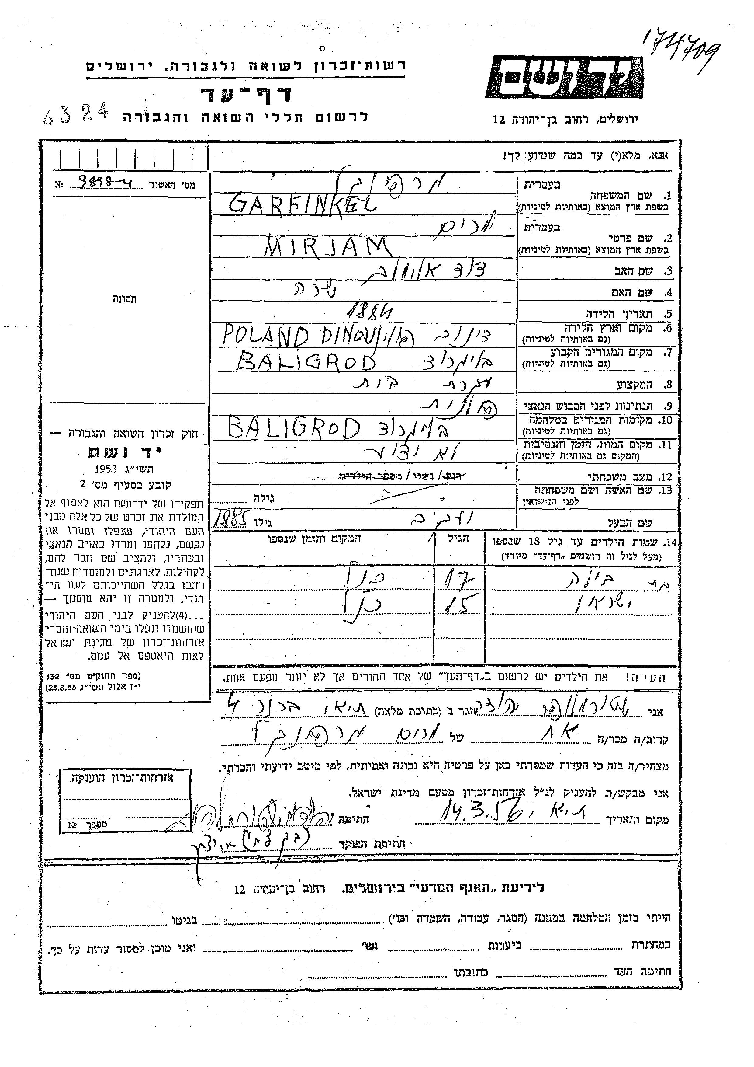 Garfinkel Yisrael Baligrod, Polen Gedenkblatt