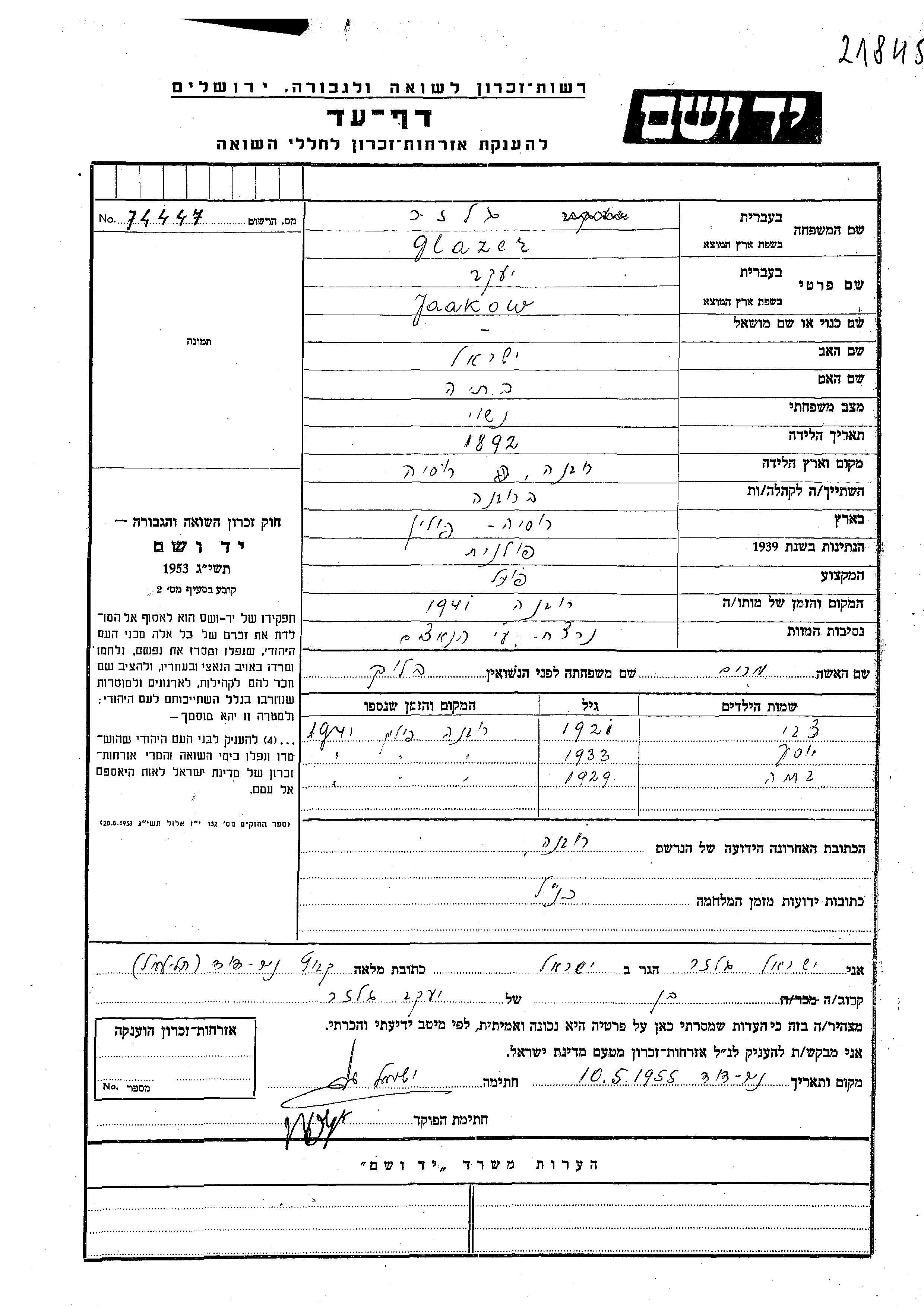 Glazer Avraham 1929 Rowno, Polen Gedenkblatt