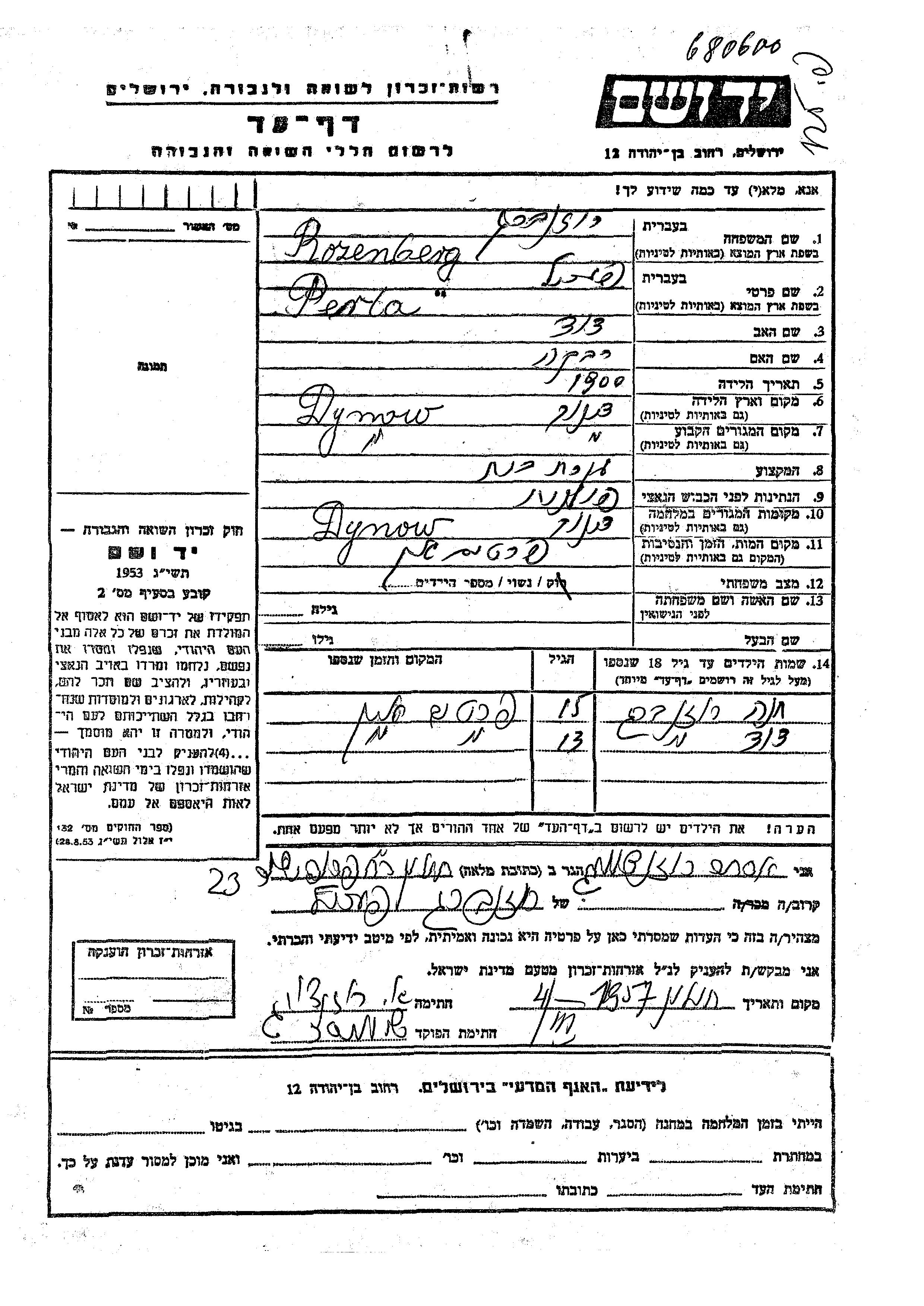 David Rozenberg wurde Er war der Sohn von Perla. Er war Kind. Vor dem Zweiten Weltkrieg lebte er in Dynow, Polen. Während des Krieges war er in Dynow, Polen.