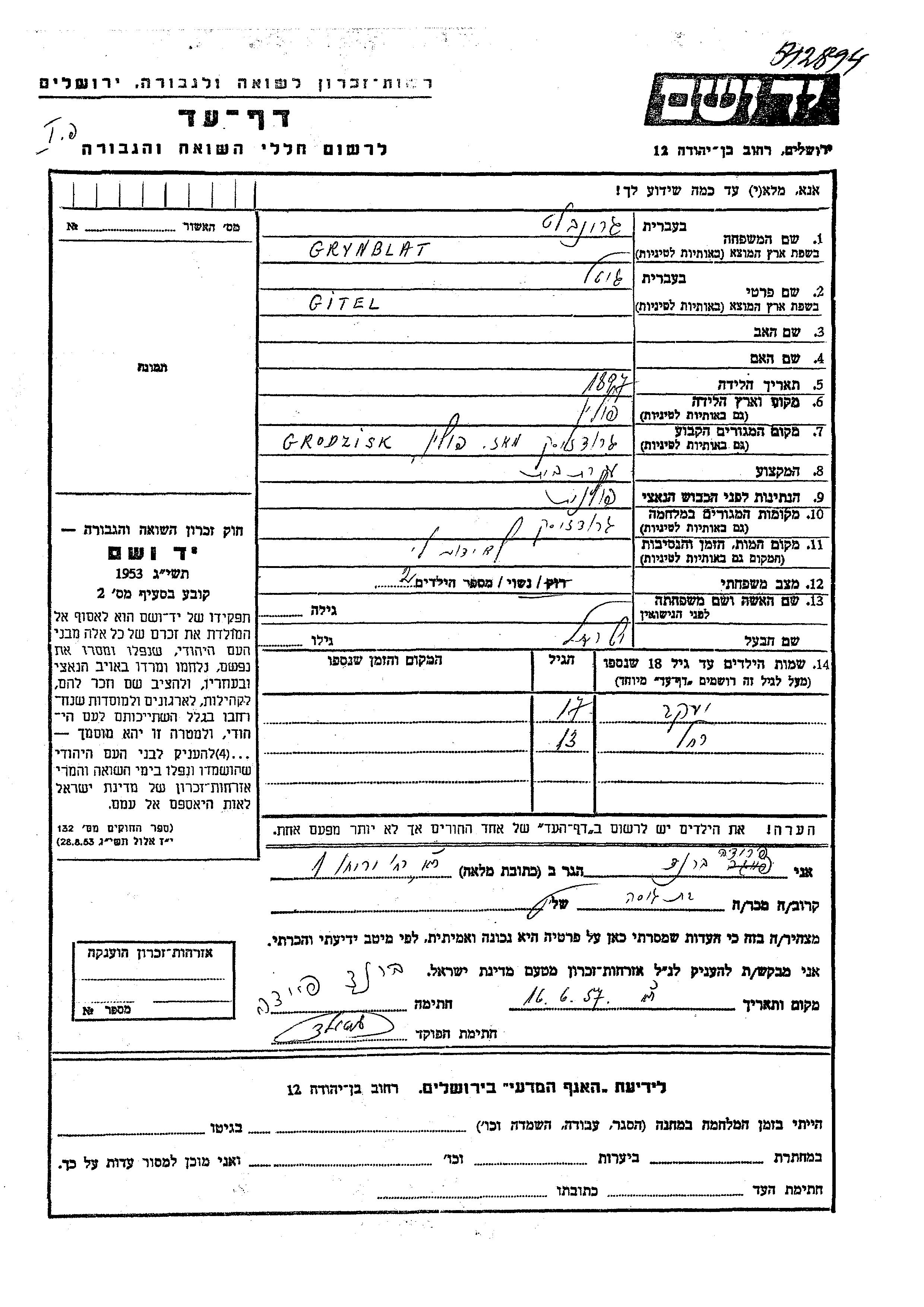 Grynblat Yaakov Grodzisk, Polen Gedenkblatt