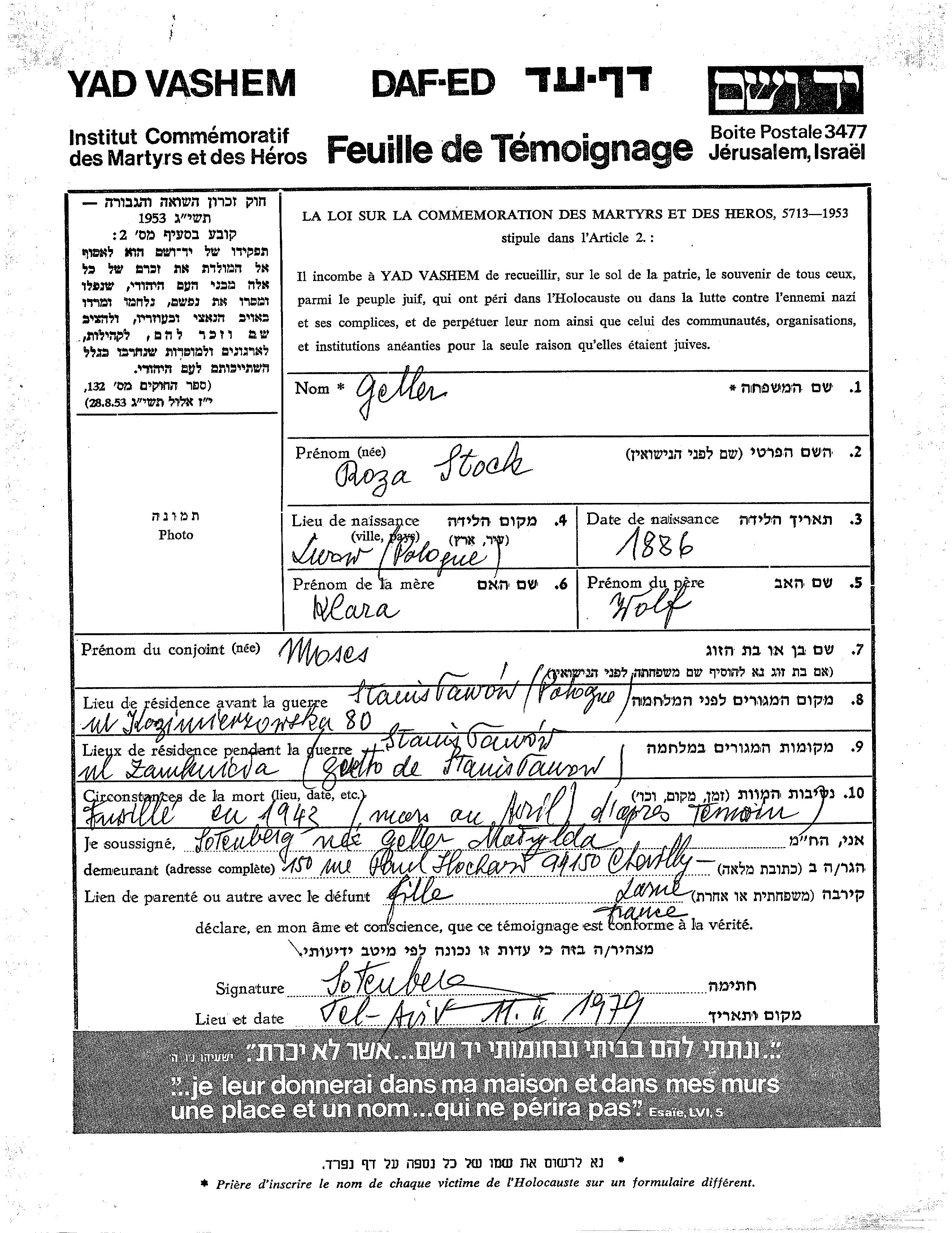 Roza Geller, geb. Stock wurde im Jahr 1886 in Lwow, Polen geboren. Sie war die Tochter von Wolf und Klara. Sie war mit Moses Verheiratet. Vor dem Zweiten Weltkrieg lebte sie in Stanislawow, Polen. Während des Krieges war sie in Stanislawow, Polen.